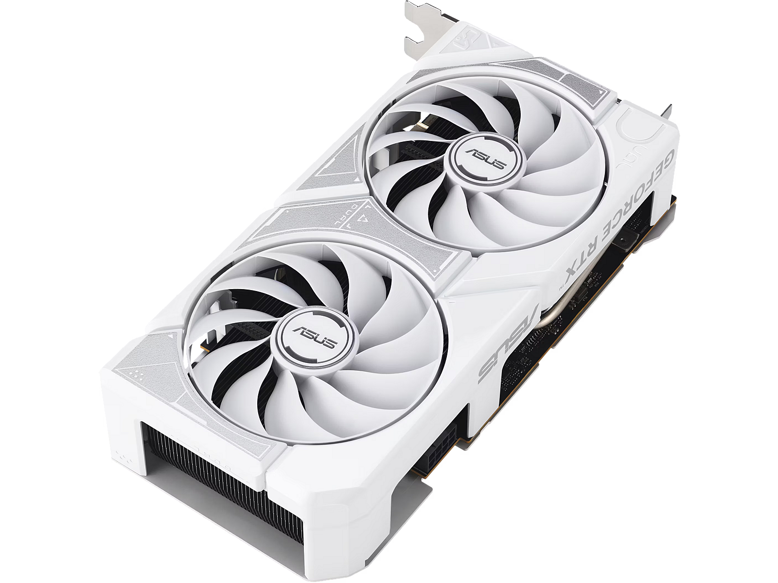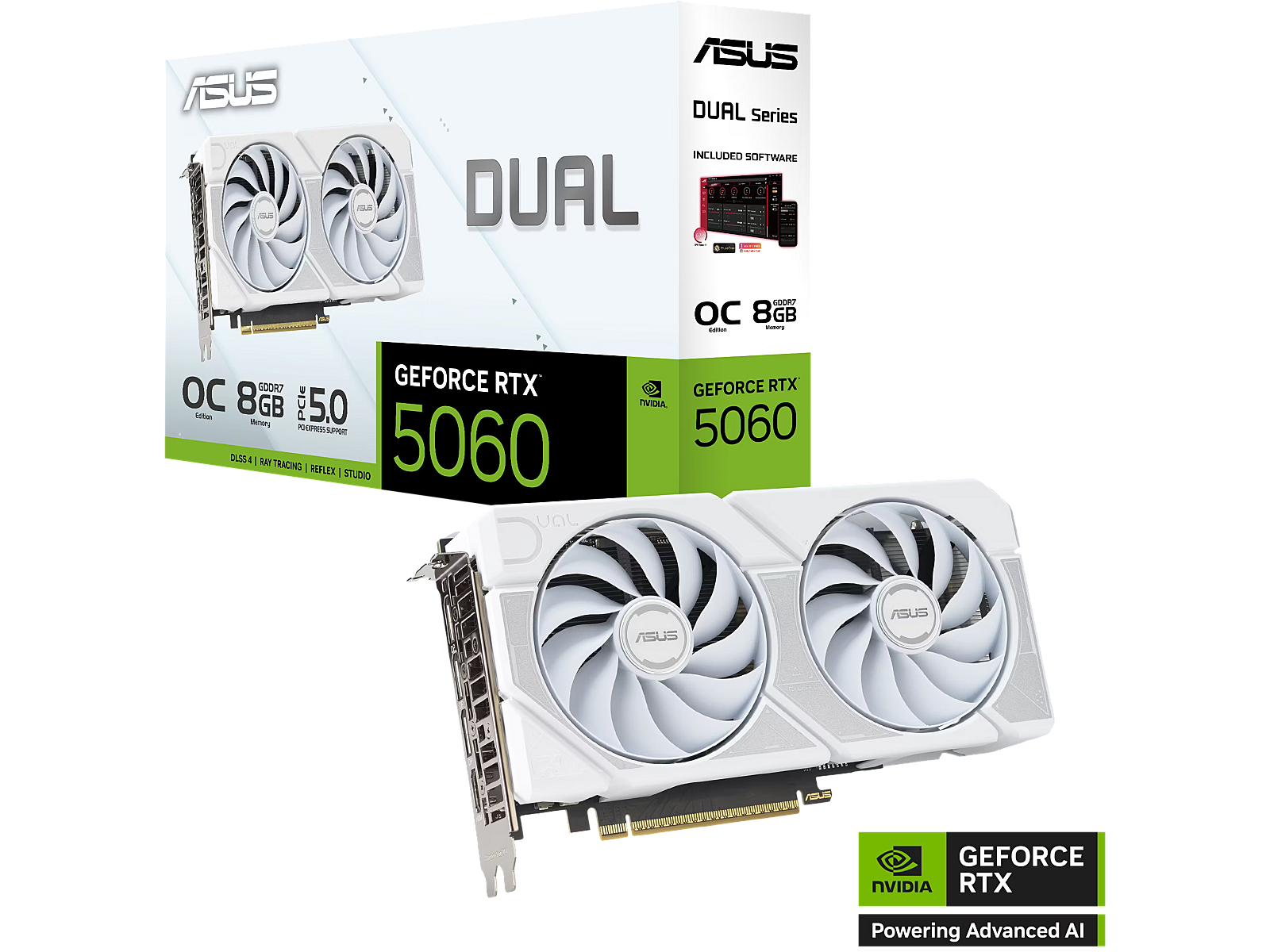 LongDesc - DUAL GEFORCE RTX™ 5060 White EditionDual Fans, Perfect FitASUS Dual GeForce RTX™ 5060 White Edition combines powerful thermal performance with broad compatibility. Advanced cooling solutions from flagship graphics cards — including two Axial-tech fans for optimizing airflow to the heatsink. Designed in a compact 2.5-slot form factor, delivering more power in less space. These enhancements make ASUS Dual the perfect choice for gamers who want heavyweight graphics performance in a compact build.Cooling2.5-slot DesignA carefully designed shroud, heatsink, and heatpipe layout enables the two Axial-tech fans to leverage chassis side-panel ventilation, delivering thermal performance that beyond the compact size.Axial-tech UpgradesTwo tried-and-true Axial-tech fans feature a smaller hub facilitates longer blades and a barrier ring to increase downward air pressure.0dB TechnologyTo eliminate unnecessary noise, the stop mode automatically halts all fans when the GPU temperature drops below 50 degrees and power consumption is low.Dual Ball Fan BearingsFan bearings come in different types, each with its own advantages. Dual ball bearings provide superior durability and can last up to twice as long as sleeve-bearing designs.Vented BackplateA vented backplate significantly enhance heat dissipation, helping to keep the GPU cooler during intense tasks. This additional airflow helps ensure optimal temperatures, boosting performance, longevity and stability by defending against overheating and thermal throttling.Unmatched ReliabilityASUS GPU GuardASUS GPU Guard applies adhesive to secure all four corners to reduce the risk of cracks.Protective BackplateThe PCB is reinforced by a backplate that adds structural rigidity, helping to prevent flex and to protect components and trace pathways from damage.Stainless Steel BracketThe mounting bracket of the Dual has been beefed up with 304 Stainless Steel that’s harder and more resistant to corrosion.EngineeringDual BIOSDo you prioritize lower core temperatures or quieter operation? Performance mode increases fan speed to keep the card running cool all the time. Quiet mode maintains the same power target and performance settings, but applies a less aggressive fan curve for quieter operation at medium temperatures. Want more control? Customize your experience with GPU Tweak III software for fine-tuned fan profiles and performance adjustments.Auto−Extreme TechnologyAuto-Extreme Technology is an automated manufacturing process that sets new standards in the industry by allowing completing all soldering to be completed in a single pass. This reduces thermal strain on components and avoids the use of harsh cleaning chemicals, resulting and minimizes in less environmental impact. The result is lower power consumption during manufacturing and a more reliable, high-quality product.lower manufacturing power consumption, and a more reliable product overall.RTX. It’s On.The Ultimate in Ray Tracing and AIRTX is the most advanced platform for full ray tracing and neural rendering technologies that are revolutionizing the ways we play and create. Over 700 games and applications use RTX to deliver realistic graphics and incredibly fast performance with cutting-edge AI features like DLSS Multi Frame Generation.CreatorsYour Creative AI-dvantageNVIDIA Studio is your creative advantage. GeForce RTX 50 Series GPUs unlock transformative performance in video editing, 3D rendering, and graphic design. Experience RTX accelerations in top creative apps, world-class NVIDIA Studio drivers engineered and continually updated to provide maximum stability, and a suite of exclusive tools that harness the power of RTX for AI-assisted creative workflows.
