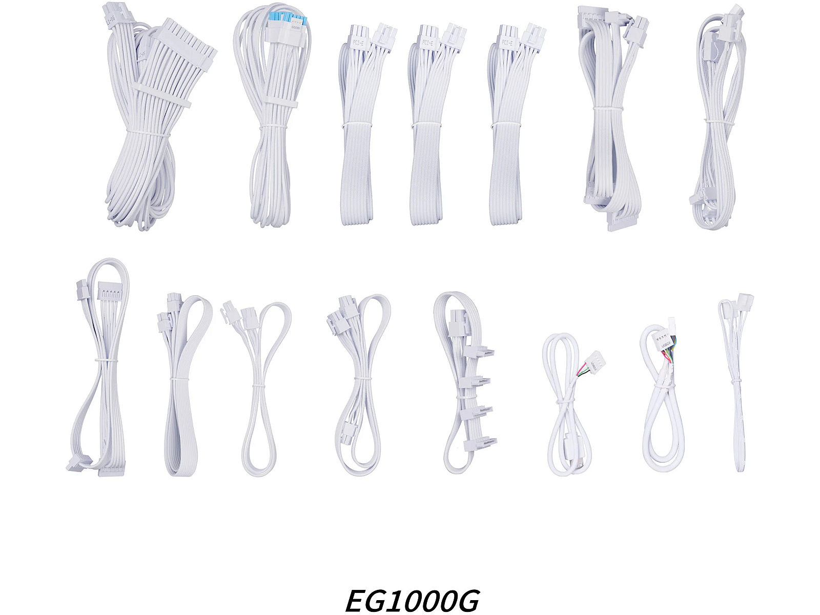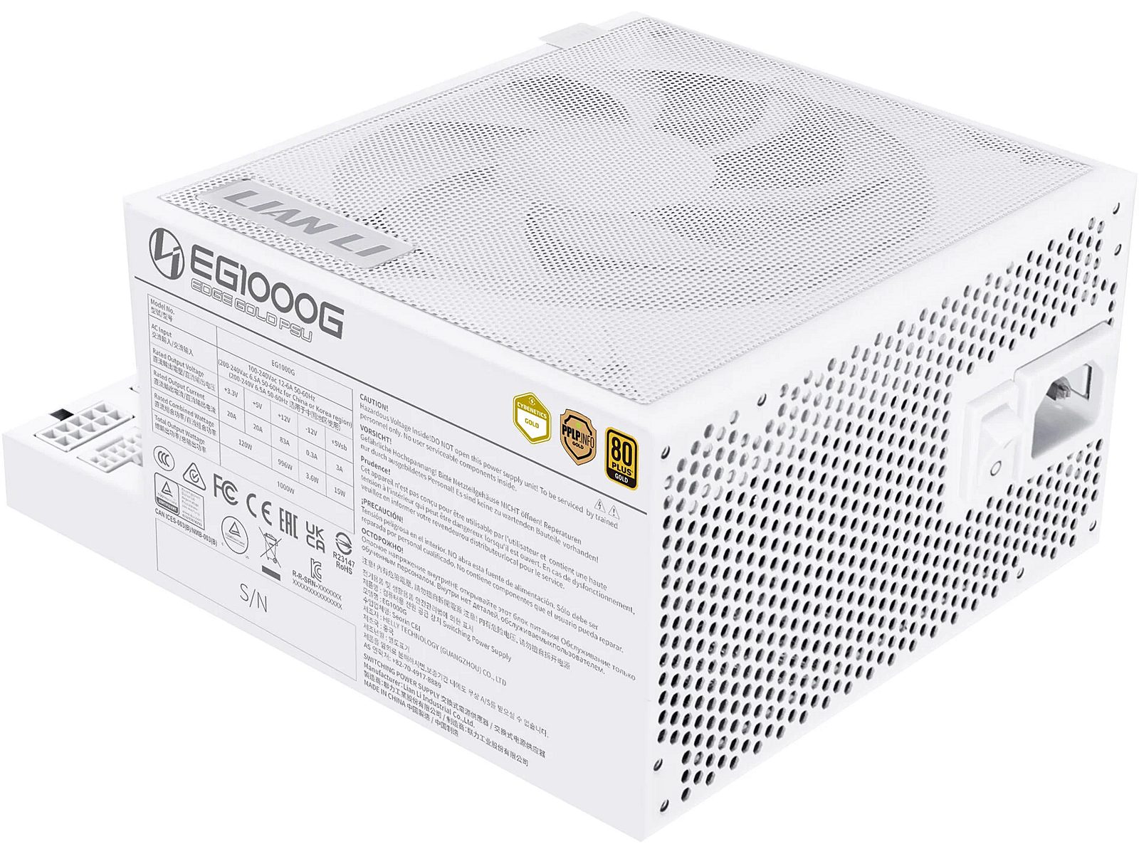 Summary - Lian Li EG1000G. Total power: 1000 W, AC input voltage: 100 - 240 V, AC input frequency: 50/60 Hz. Motherboard power connector: 20+4 pin ATX, Motherboard power cable length: 50 cm, SATA power cable length: 300,400 mm. Purpose: PC, Power supply unit (PSU) form factor: ATX, 80 PLUS certification: 80 PLUS Platinum. Product colour: White, Fan diameter: 12 cm. Cables included: CPU, PCIe, Peripheral (Molex), SATA