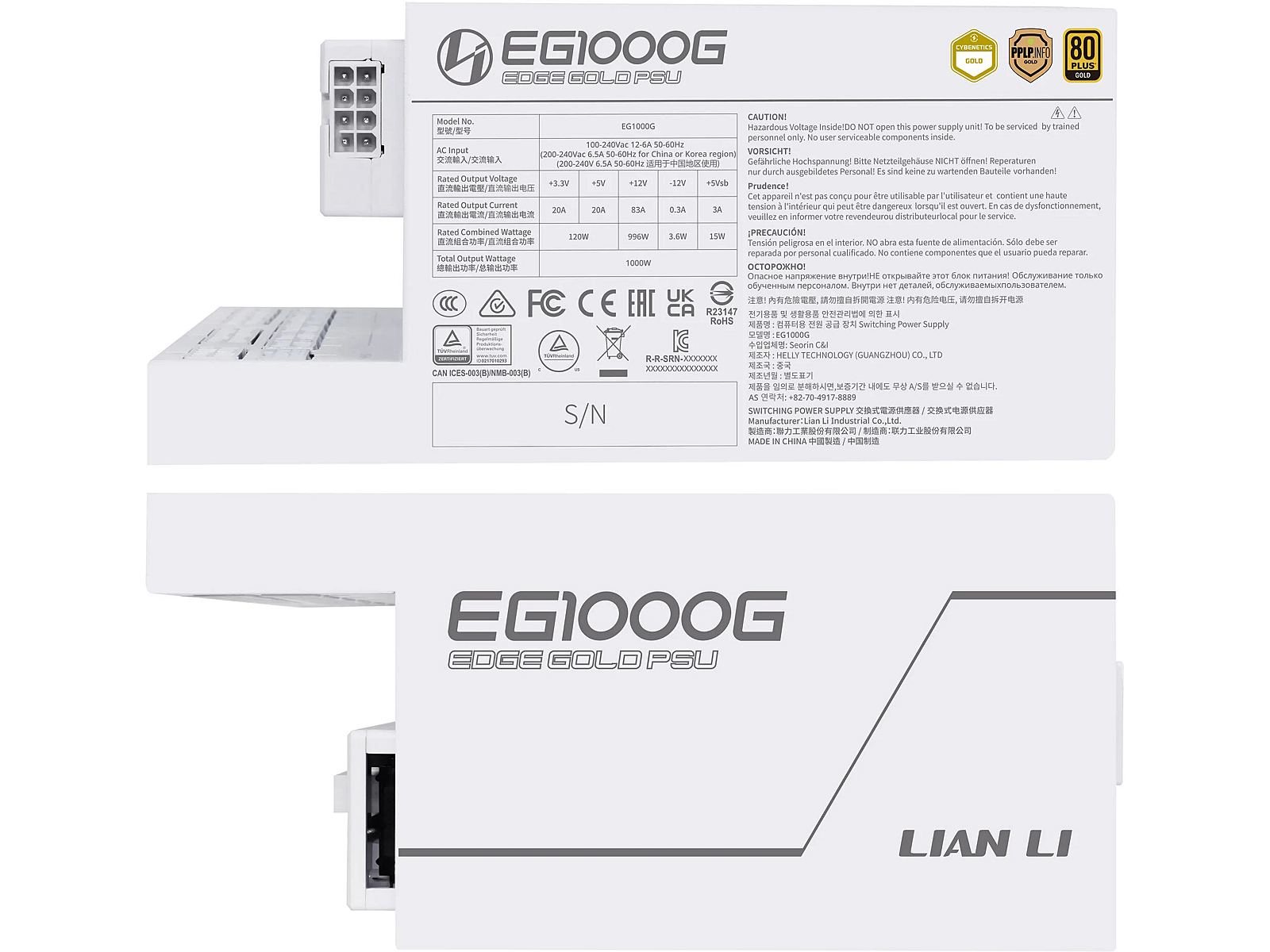 Connect the hub to a PCIe 8-PIN cable for independent operation. MAGNETIC DUST FILTER The magnetic mesh dust filter on top of the fan can be easily removed for regular cleaning, ensuring dust-free operation. A high porosity of 66.9% ensures ample ventilation and airflow with quiet fan operation, extending the PSU’s lifespan and reliability. CONVENIENT CABLE MANAGEMENT Engineered specifically for dual-chamber chassis such as the LIAN LI O11 series, the EDGE Gold PSU’s L-shape design is ideal for vertical installation in the second chamber. This outward-facing interface is more user-friendly than traditional side-mounted designs, making cable management simple and accessible for both beginners and experienced builders. LONGER CABLE REACH FOR VERSATILE BUILDS The Edge Gold PSU features new cables that are even longer, making it ideal for dual-chamber or regular tower chassis, enhancing flexibility and ensuring optimal cable management for all kinds of builds with ease. EFFICIENCY LEVEL CERTIFIED Achieving the 80 PLUS Gold, Cybenetics Platinum and PPLP Gold certifications, the EDGE Series ensures top-tier energy efficiency, reducing power consumption and heat output while delivering reliable, stable performance. COOL IN SILENCE Designed for optimal performance, the open style mesh facilitates excellent heat dissipation for internal components. This feature is especially beneficial for the 120 MM PWM fan, which operates efficiently with minimal noise, ensuring the system stays cool and quiet even under heavy loads. STABLE DUAL COLOR PCIE5.1 CONNECTOR LIAN LI’s in-house R&D designed a high-quality 12V-2×6 dual-color connector featuring alloy copper soldered terminals for secure and efficient power delivery, enhancing system stability and performance. The terminal maintain a contact resistance below 1.5mΩ after 50 plug/pull cycles, compared to ordinary terminals at 2-3mΩ, enhancing the connector’s performance and long-term reliability. BRAIDED-TEXTURE SLEEVED CABLES FOR A CLEAN BUILD The PSU comes equipped with all cables featuring a braided texture. The 20+4pin, CPU, PCIe 6+2pin, and 12V-2×6 cables are designed with easy-to-adjust cable combs, ensuring very clean curves and cable runs for an aesthetically pleasing and organized dual chamber build. INDUSTRIAL GRADE CAPACITORS The EDGE Gold PSU integrates the German EPCOS capacitors or same level Japanese capacitors, offering compact, robust performance with higher tolerances to harsh temperatures and environments. COMPREHENSIVE CONNECTORS The modular cables have a new longer design compared to the previous EDGE PSU, which ensures easy component reach and efficient cable management. SUFFICIENT PROTECTION Features OCP (Over Current Protection), OVP (Over Voltage Protection), SCP (Short Circuit Protection), OPP (Over Power Protection), UVP (Under Voltage Protection), OTP (Over Temperature Protection), SIP (Surge Intensity of election flow Protection), NLO (No Load Operation), and an Inrush Current Limiter that ensures the EDGE GOLD delivers continuously stable and reliable power.L-Shape design for dual chamber case80 PLUS Platinum EfficiencyBuilt-in USB expantion hub with 4 internal USB 2.0 headersIntegrating German EPCOS bulk capacitorsIn-house R&D 12V-2×6 alloy copper soldered terminalsATX 3.0/3.1 compliant PSUFull modular sleeved cable with cable comb MB/CPU/GPU connectors