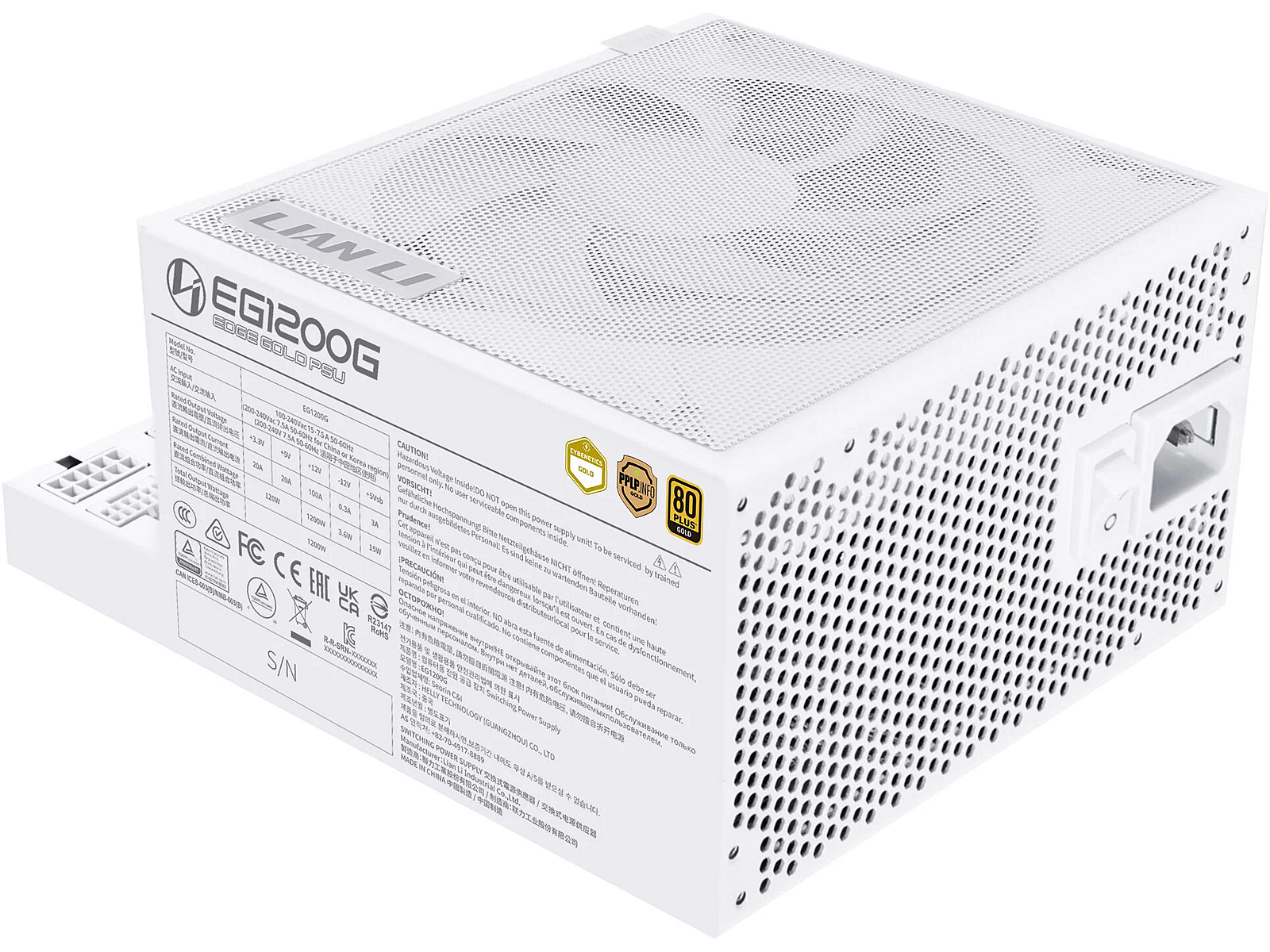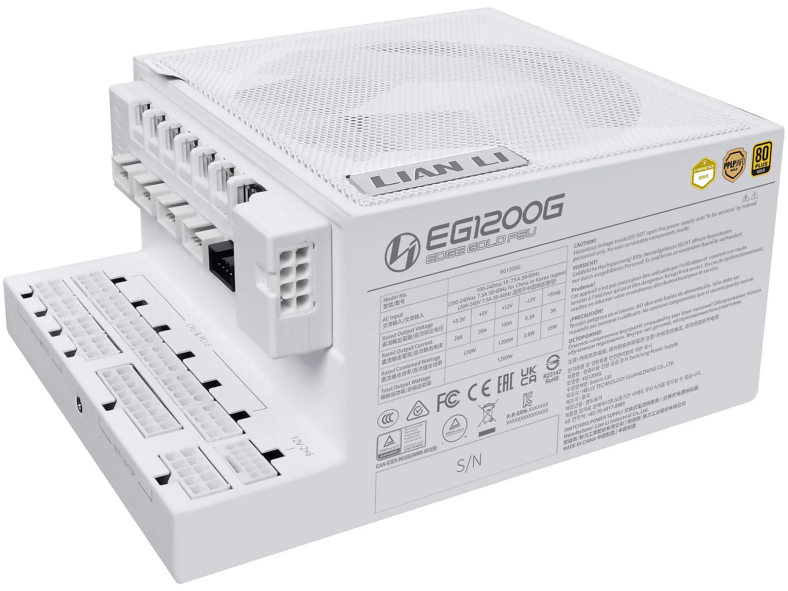 Summary - Lian Li EG1200G. Total power: 1200 W, AC input voltage: 100 - 240 V, AC input frequency: 50/60 Hz. Motherboard power connector: 24-pin ATX, Motherboard power cable length: 62 cm, SATA power cable length: 300,400 mm. Purpose: PC, Power supply unit (PSU) form factor: SFX, 80 PLUS certification: 80 PLUS Gold. Product colour: White, Fan diameter: 12 cm. Cables included: CPU, PCIe, Peripheral (Molex), SATA