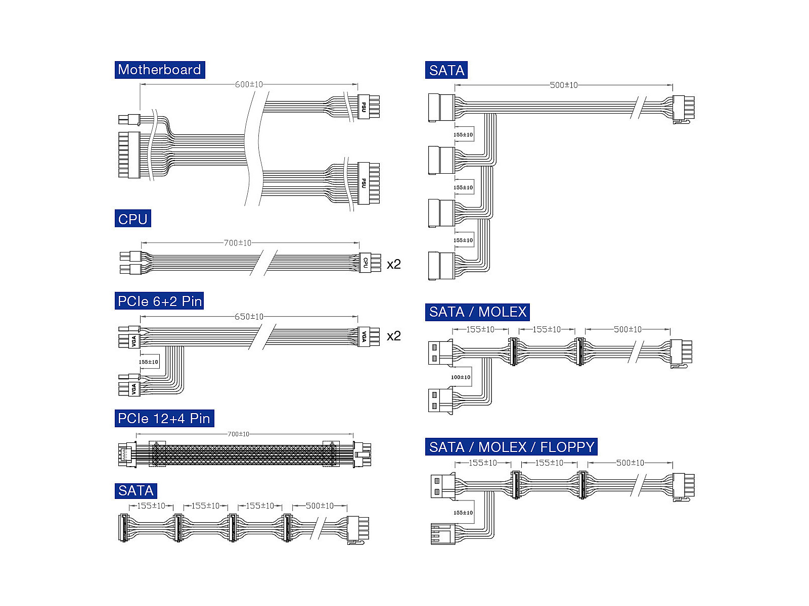 Packaging content - Cables included - CPU, PCIe, Peripheral (Molex), SATA
