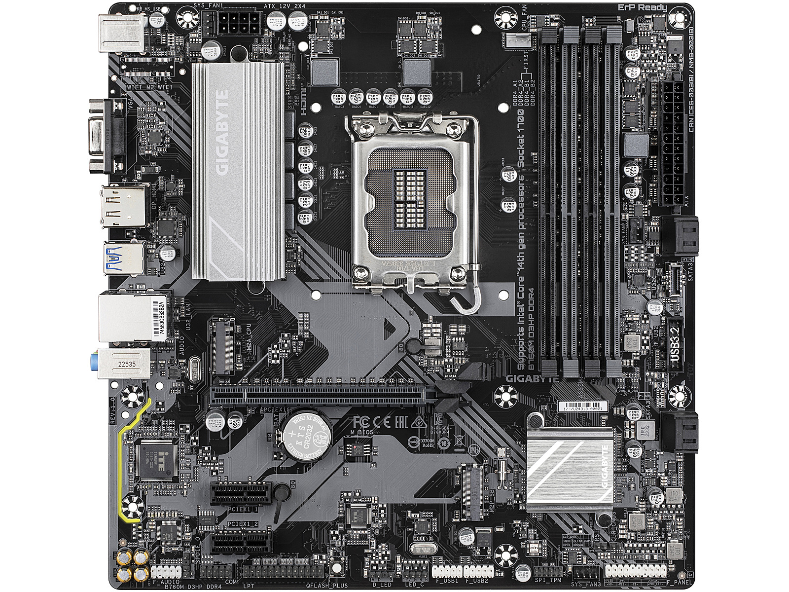ShortSummaryDescription - GIGABYTE B760M D3HP DDR4 Motherboard - Supports Intel Core 14th Gen CPUs, 4+1+1 Phases Digital VRM, up to 5333MHz DDR4 (OC), 2xPCIe 4.0 M.2, GbE LAN, USB 3.2 Gen1, Intel, LGA 1700, Intel® Celeron®, Intel® Core™ i3, Intel® Core™ i5, Intel® Core™ i7, Intel® Core™ i9,..., LGA 1700, 128 GB, DDR4-SDRAM