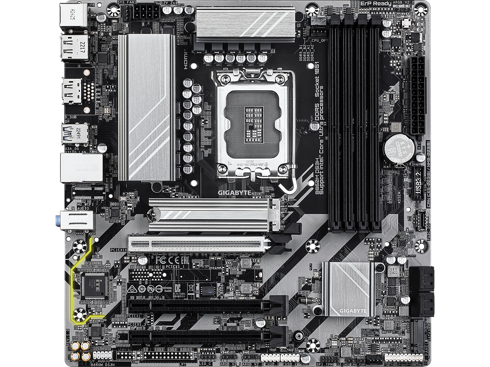 ShortSummaryDescription - GIGABYTE B860M DS3H Motherboard - Intel Core Ultra Series CPUs, 5+1+2+1 Phases VRM, up to 9066MHz DDR5, 1xPCIe 5.0 + 1xPCIe 4.0 M.2, 2.5GbE LAN, USB 3.2 Gen 2, Intel, LGA 1851 (Socket V1), Intel® Core™ Ultra (Series 1), Intel Core Ultra (Series 2), LGA 1851, DDR5-SDRAM, 256 GB
