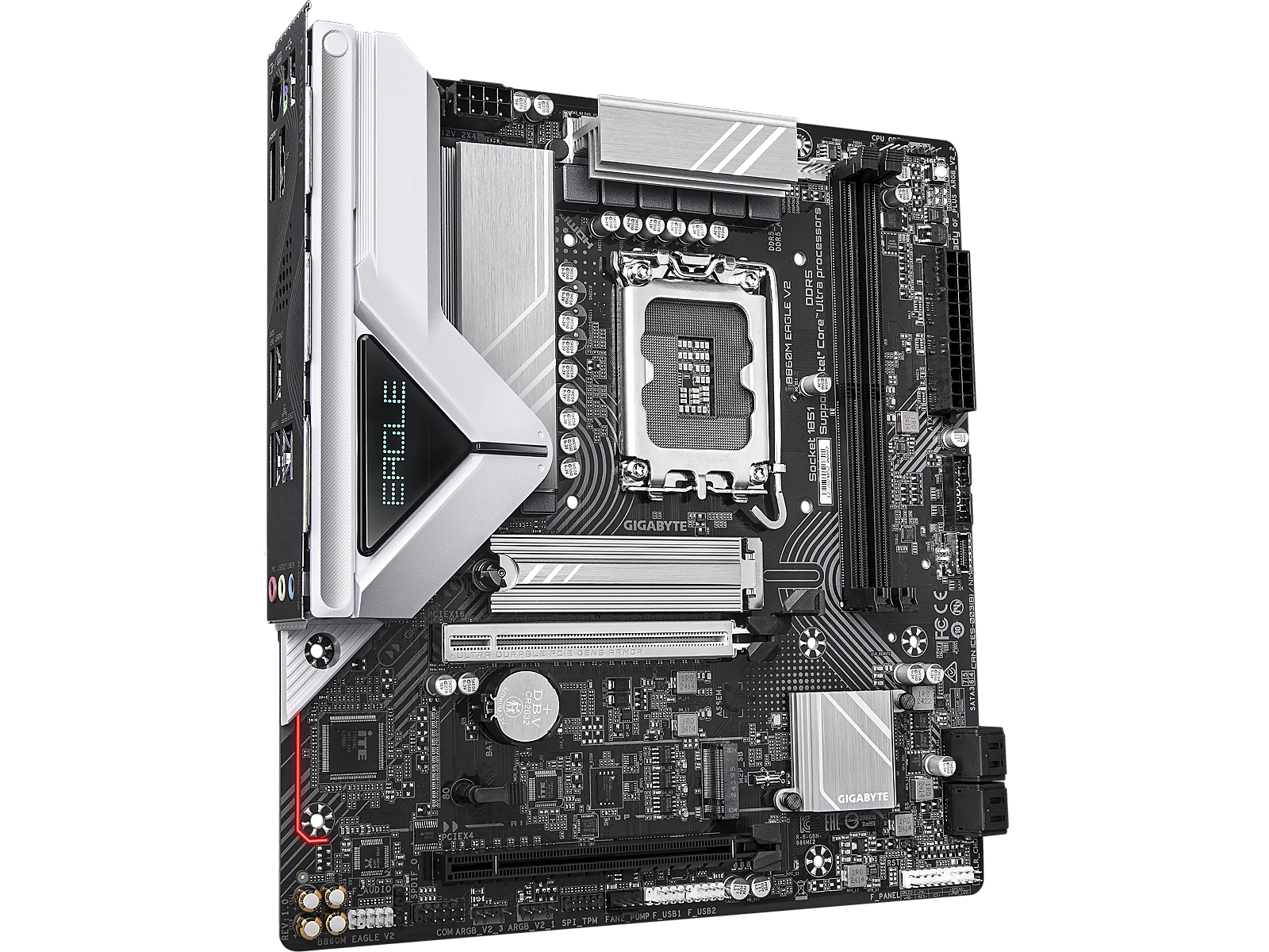 LongSummaryDescription - GIGABYTE B860M EAGLE V2 Motherboard - Intel Core Ultra Series CPUs, 6+1+2 Phases VRM, up to 9066MHz DDR5, 1xPCIe 5.0 + 1xPCIe 4.0 M.2, 2.5GbE LAN, USB 3.2 Gen 1. Processor manufacturer: Intel, Processor socket: LGA 1851 (Socket V1), Compatible processor series: Intel Core Ultra (Series 2). Supported memory types: DDR5-SDRAM, Maximum internal memory: 128 GB, Memory slots type: DIMM. Supported storage drive interfaces: M.2, PCI Express 4.0, PCI Express 5.0, SATA III, Supported storage drive types: HDD & SSD, RAID levels: 0, 1, 5, 10. Maximum resolution: 4096 x 2160 pixels. Ethernet interface type: 2.5 Gigabit Ethernet, LAN controller: Realtek RTL8125