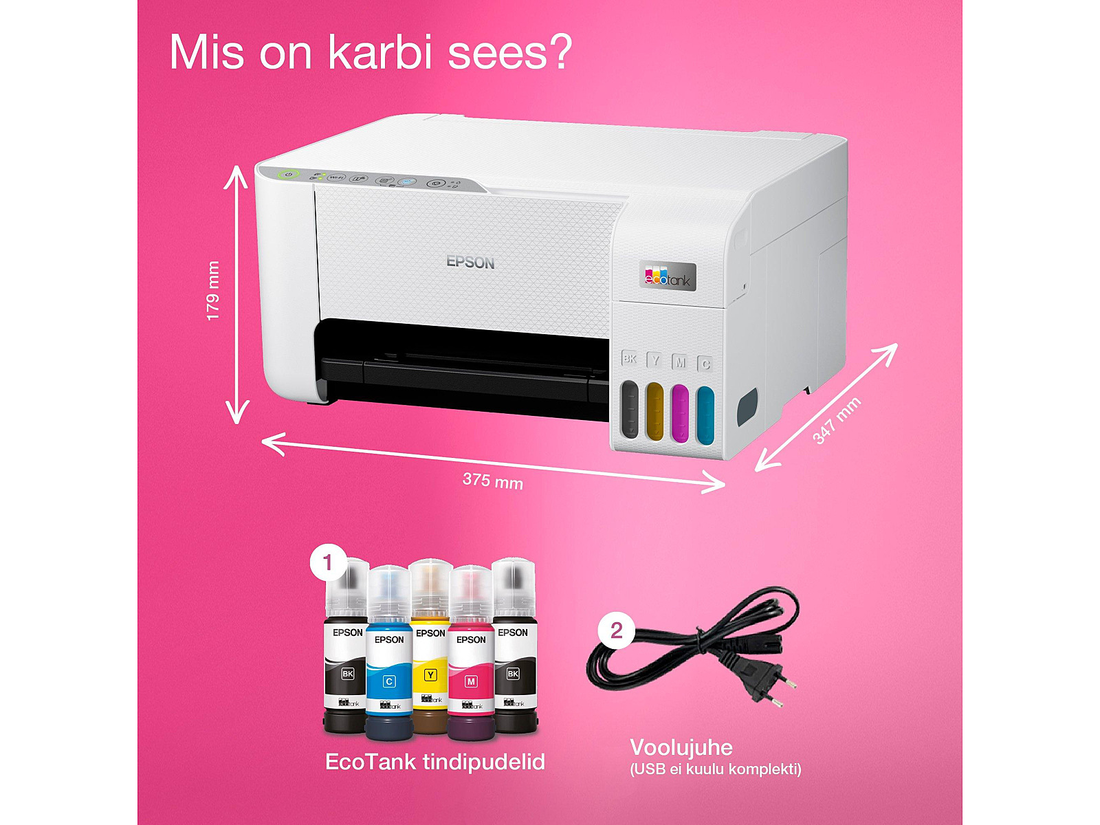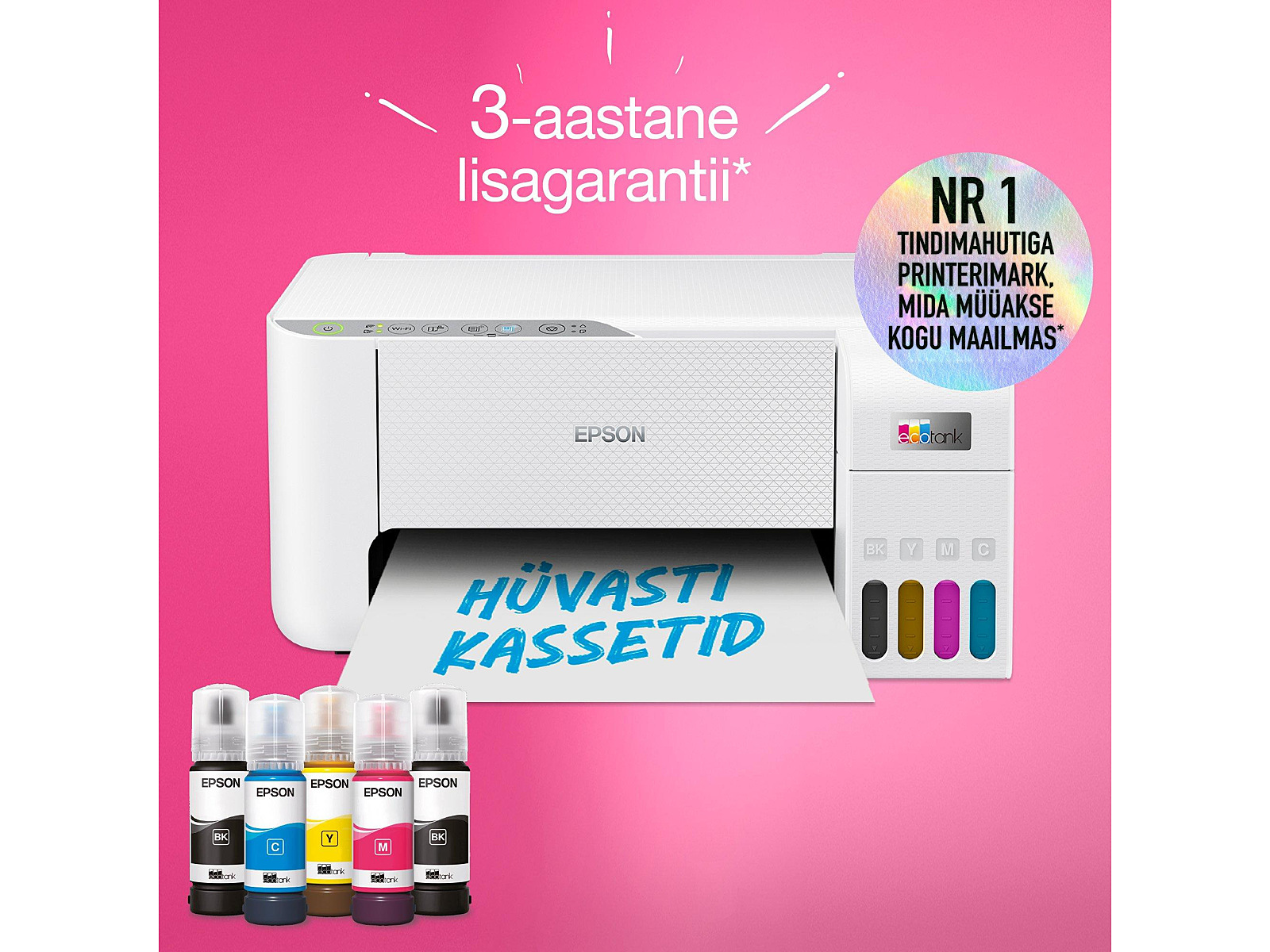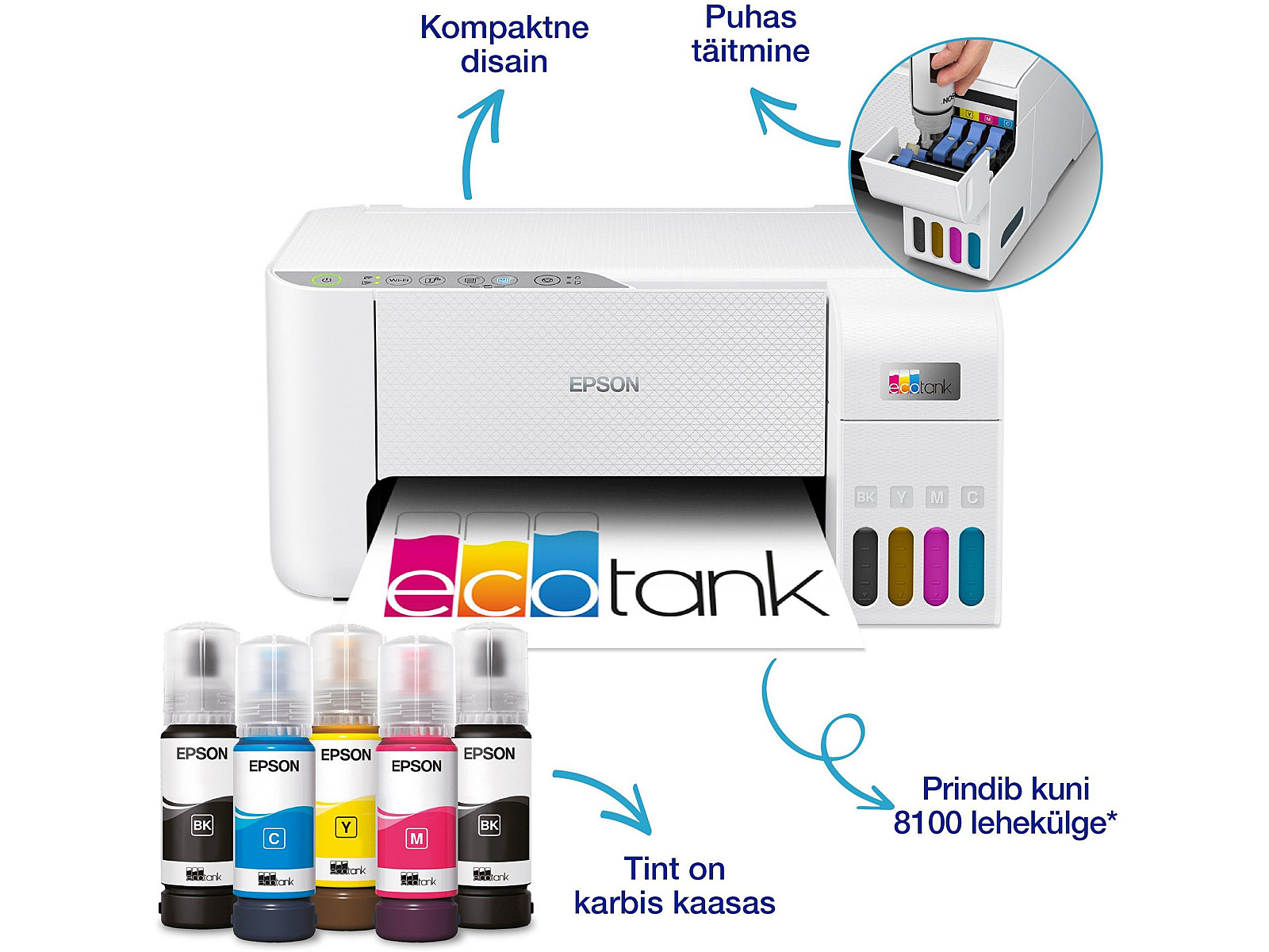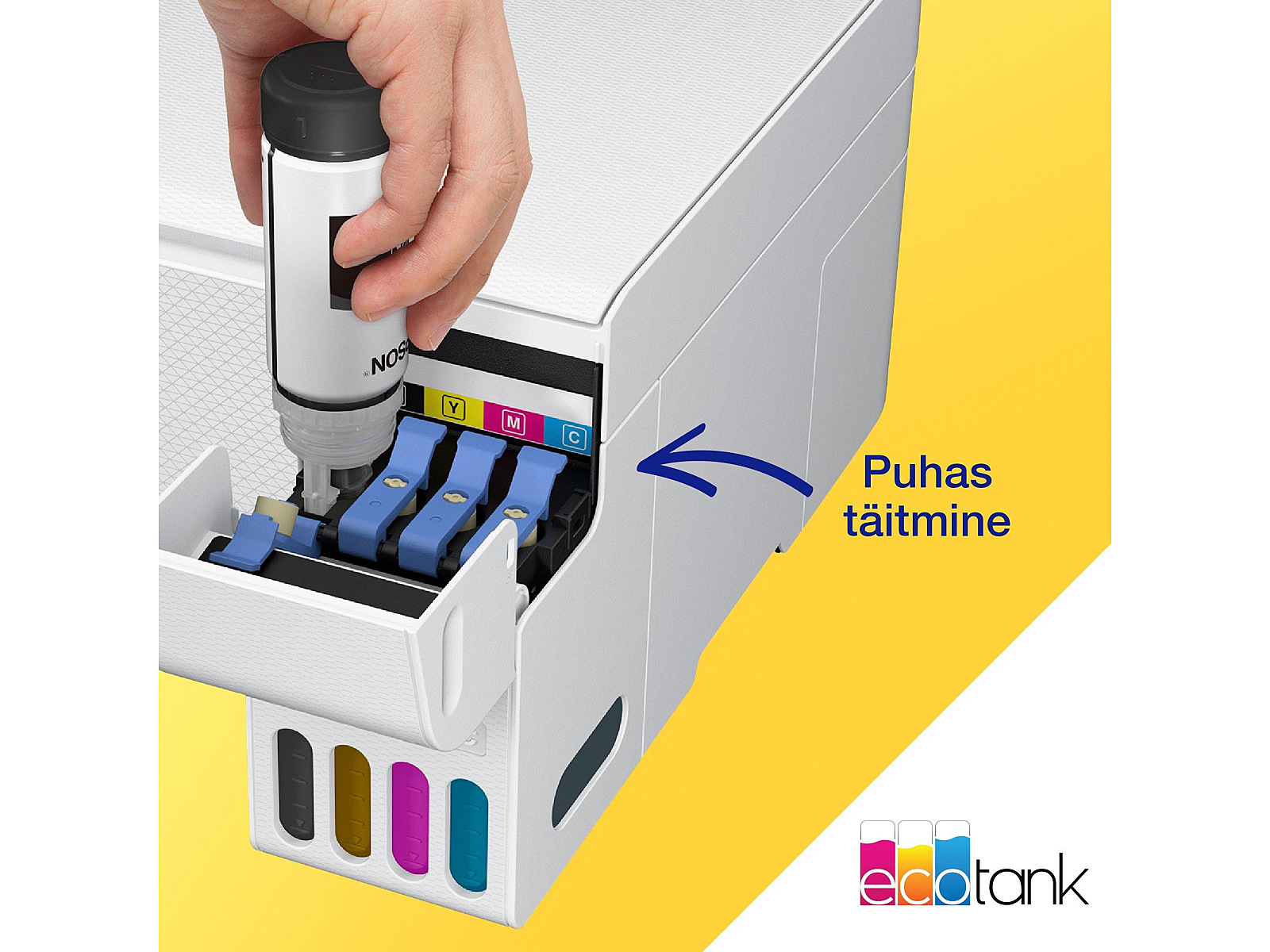 description_et - Ērta drukāšana bez stresa ar līdz pat 66 tintes kārtridžiem vienā kasetnē - ietaupiet līdz pat 90 % drukāšanas izmaksu, izmantojot atkārtoti uzpildāmus tintes kasetņus A4 daudzfunkciju printeris - augstas kvalitātes drukāšana, kopēšana un skenēšana vienā ierīcē Bezvadu savienojamība ļauj drukāt no jebkuras vietas - izmantojiet Epson Smart Panel lietotni, lai iestatītu, uzraudzītu, drukātu un darītu daudz vairāk no viedierīces Izdrukā līdz 8100 lappusēm ar melno tinti un 6500 lappusēm ar krāsaino tinti - viss iekļauts komplektā, tikai pievienojiet papīru Vispasaules tintes printeru zīmols numur 1 - 2023. gads. 80 miljoni pasaulē pārdotu EcoTank printeru 2023. gada martā Vienkārša, bezrūpīga tintes tvertnes sistēma ļauj uzpildīt tinti no pudelītēm. Turklāt EcoTank ar atslēgu bloķētā pudelīšu sistēma nodrošina, ka process nenotraipās. Atvadieties no kārtridžiem EcoTank piedāvā bezrūpīgu drukāšanu mājās - īpaši lielas ietilpības tintes tvertnes ļauj tīri uzpildīt tinti, un pudeļu bloķēšanas konstrukcija ir konstruēta tā, lai tiktu ielādētas tikai pareizās tintes. Tintes līmeņa indikators priekšpusē ļauj viegli redzēt, kad ir pienācis laiks uzpildīt tvertni. Citi veidi, kā ietaupīt Šis ekonomiskais printeris ietaupa līdz pat 90 %* drukāšanas izmaksu, un tā komplektācijā ir iekļauta tinte** līdz pat 3 gadiem. Ar iekļauto tinti var izdrukāt līdz pat 8100 lappusēm melnā krāsā un 6500 lappusēm krāsainā krāsā***. Tintes kārtridžu rezerves komplekts ir līdzvērtīgs līdz pat 66 tintes kārtridžiem. Epson Smart Panel lietotne Šī lietotne ļauj jums kontrolēt printeri no viedierīces. Drukājiet dokumentus un attēlus, iestatiet, sekojiet līdzi un novērsiet problēmas ar printeri - visu to varat izdarīt no tālruņa vai planšetdatora. Ar daudzfunkcionālu 100 lapu papīra paplāti, kas ielādējama no aizmugures, bezrobežu fotoattēlu drukāšanu (līdz 10 x 15 cm) un drukāšanas ātrumu līdz 10 lappusēm minūtē ir viegli veikt dažādus uzdevumus. Mūsdienīgs elastīgums Pateicoties kompaktajam dizainam, WiFi un WiFi Direct savienojamībai, printeri ir viegli pievienot esošajai mājas iekārtai, lai drukātu no tālruņa, planšetdatora un klēpjdatora. Bezsiltumizturīga tehnoloģija Micro Piezo bezsiltumizturīgā tehnoloģija nodrošina mazāku enerģijas patēriņu un samazina nepieciešamību pēc rezerves daļām. Drukāšanas galviņa ir iepriekš uzstādīta, tāpēc printera iestatīšana ir bez problēmām. * Pamatojoties uz Epson aprēķiniem par vidējo lappušu izmaksu ietaupījumu un vidējo tintes kārtridžu skaitu, kas nepieciešams, lai izdrukātu tādu pašu lappušu skaitu, izmantojot Epson EcoTank "101" un "103" tintes kārtridžus.