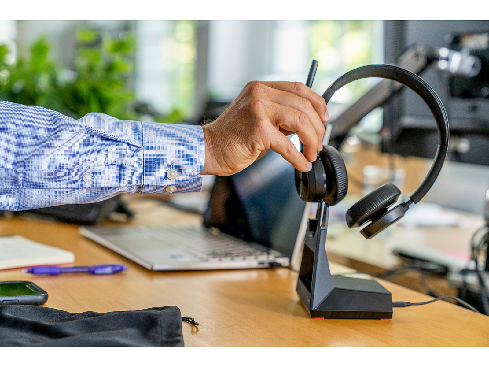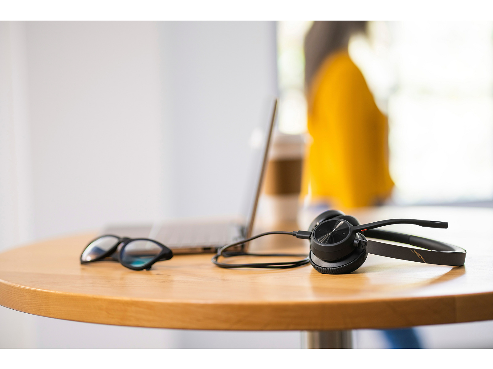 The headphones connection to the computer. A cable for a long-term and stable sound experience is the most popular type of connection.