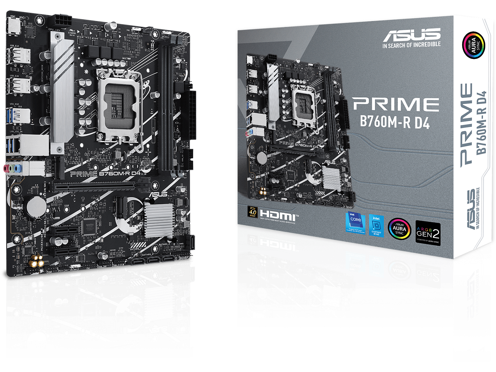 LongDesc - ASUS Prime series motherboards are expertly engineered to unleash the full potential of 14th & 13th Gen Intel® Core™ Processors. Boasting a robust power design, comprehensive cooling solutions and intelligent tuning options, PRIME B760M-R D4 provides users and PC DIY builders with a range of performance optimizations via intuitive software and firmware features.FLEXIBILITYComprehensive controls form the foundation of the ASUS PRIME series. The PRIME B760 motherboard packs flexible tools to tune every aspect of your system, enabling performance tweaks to perfectly match the way you work to maximize productivity.Intelligent ControlASUS Intelligent Control makes your PC smart. Along with taking care of complex tuning and dynamically optimizing essential aspects of your system, it offers intelligently simplified options for newcomers to PC DIY, as well as more comprehensive features for seasoned veterans.All-Around Energy EfficiencyThe Power Saving function contains several settings can easily optimize power consumption and maximize energy savings. You can enable a CPU power limit, darken Aura lighting, and set the fan profile to a power saving mode. You can also toggle the Power Saver plan that is built into Microsoft Windows.Flexible Air-Cooling ControlsASUS Fan Xpert 2+ software provides comprehensive control over fan. There’s an Extreme Quiet mode that reduces fan speeds to below the default minimum to keep your system whisper-quiet when performing light tasks. Fan can also be controlled via the UEFI BIOS.Precise Digital Power ControlThe Digi+ voltage-regulator module (VRM) delivers real-time control over voltage droop, automatically switching frequency and power-efficiency settings. It also allows you to fine-tune your CPU for ultimate stability and performance.UEFI BIOSThe renowned ASUS UEFI BIOS provides everything you need to configure, tweak and tune your system. It offers intelligently simplified options for PC DIY beginners, as well as comprehensive features for seasoned veterans.Advanced Tuning for Serious TweakersAn intuitive Advanced mode offered via the UEFI lets you take complete control. A built-in search feature makes it easy to find options, and various advanced functions let you intelligently make nuanced adjustments so you can dial in performance just the way you want.Quick and Simple SetupEZ mode displays vital settings and stats and also offers guided wizards, drag-and-drop functionality, and one-click application of important settings — all to help you get your rig up and running in no time.Intuitive Graphical Fan ControlFine-tune individual fan settings simply by dragging a curve with the mouse.Aura On/Off Mode (Stealth)Easily enable or disable Aura RGB lighting or every onboard LED, for a subdued aesthetic touch.COOLINGPRIME B760 series are engineered with multiple onboard heatsink and an array of hybrid fan headers to ensure your rig stays cool and stable under intense workloads.HeatsinkVRM Heatsink and Thermal PadVRM heatsink and thermal pad improve heat transfer from the MOSFETs and chocks for better cooling performance.Cooler by DesignPRIME B760 series features comprehensive cooling controls that are configurable via FAN Xpert 2+ software or via the UEFI BIOS.Multiple Temperature SourcesEach header can dynamically reference three thermal sensors. FAN Xpert 2+ allows you to map the temperature of supported ASUS graphics cards to optimize cooling for GPU- and CPU-intensive tasks.4-Pin PWM/DC FanChassis fan headers support auto-detection of PWM or DC fans.PERFORMANCEThe PRIME B760 series are built to handle the high core counts and bandwidth demands of 14th & 13th Gen Intel® Core™ Processors. ASUS B760 motherboard provides all the fundamentals to boost daily productivity, so your system will be ready for action with stable power, intuitive cooling and flexible data transfer options.Robust Power DesignStable power is essential to extract every last bit of performance out of Intel® processors. The PRIME B760M-R D4 is geared to cater to the demands of these high-core-count CPUs.MemoryDDR4 SupportImprovements to trace routing design provide the latest Intel® processors with enhanced access to memory bandwidth. ASUS technology carefully maps memory signal pathways across different PCB layers to reduce path distance, and it adds shielding zones that significantly reduce crosstalk.StorageTwo M.2 Slots (up to 64 Gbps)The PRIME B760 motherboard offers a total of two M.2 slots that support data-transfer speeds of up to 64 Gbps via PCIe 4.0, enabling quicker boot-up and app load times with OS or application drives.*Actual transmission speeds will be lower than the theoretical maximum speed.ConnectivityPCIe 4.0 SlotThe PRIME B760 motherboard is designed specifically for 14th, 13th and 12th Gen Intel® CPUs and offer PCIe 4.0 connectivity for the latest GPUs.Realtek 2.5 Gb EthernetRealtek 2.5 Gb Ethernet reduces CPU overhead and offers exceptionally high TCP and UDP throughput for faster, smoother data transfers.LANGuardASUS LANGuard is a hardware-level network protection feature that integrates advanced signal-coupling technology and premium anti-EMI surface-mounted capacitors to improve throughput and ensure a more reliable connection.Combined onboard features deliver elevated audioIntelligent design and premium hardware create audio quality unlike anything you’ve ever experienced.Audio ShieldingAudio shielding ensures precision analog/digital separation and greatly reduced multi-lateral interference.Dedicated Audio PCB LayersSeparate layers for left and right tracks ensures both channels deliver consistent, equal quality.Premium Audio CapacitorsProvides warm, natural, and immersive sound with exceptional clarity and fidelity.Aura SyncOutshine the CompetitionA well-tuned enthusiast system deserves a matching aesthetic. ASUS Aura offers full RGB lighting control with a variety of functional presets for the built-in RGB LEDs as well as strips and device