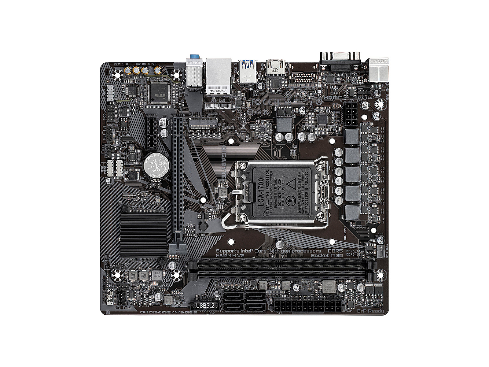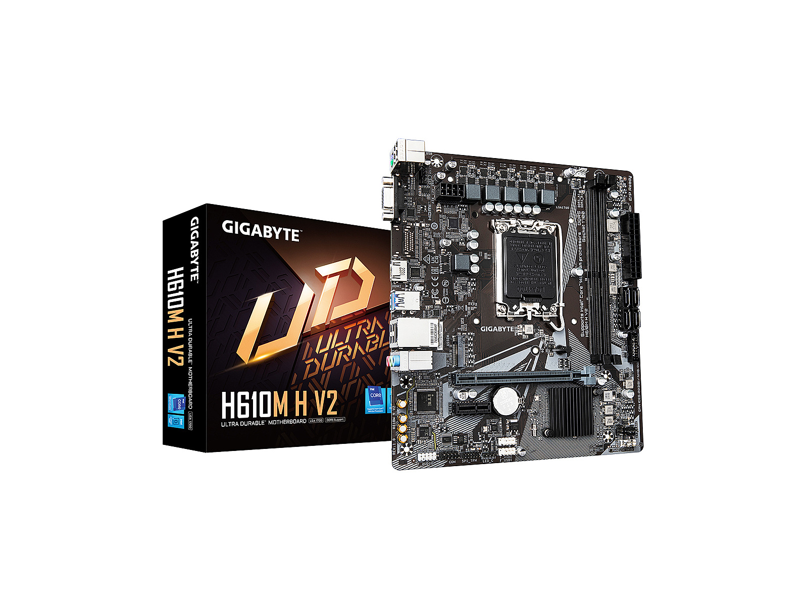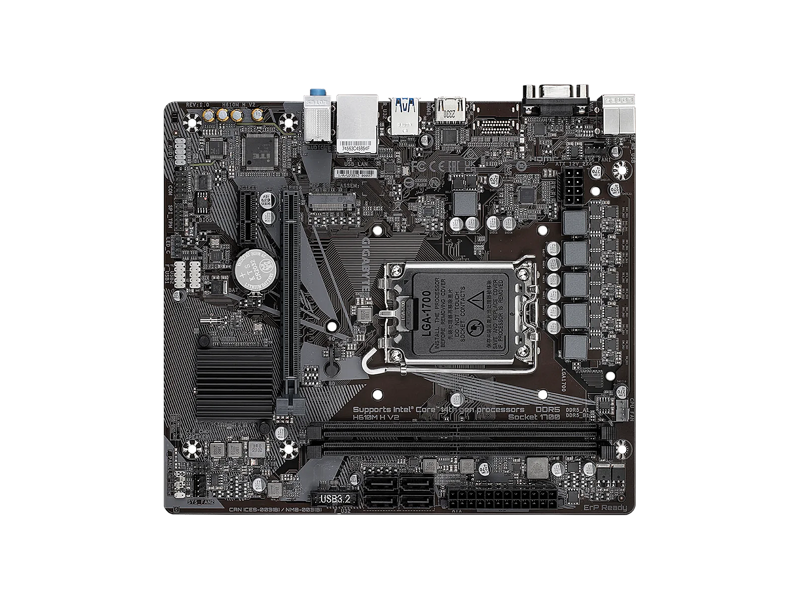 ShortSummaryDescription - GIGABYTE H610M H V2 Motherboard - Supports Intel Core 14th CPUs, 4+1+1 Hybrid Digital VRM, up to 5600MHz DDR5, 1xPCIe 3.0 M.2, GbE LAN, USB 3.2 Gen 1, Intel, LGA 1700, Intel® Celeron®, Intel® Core™ i3, Intel® Core™ i5, Intel® Core™ i7, Intel® Core™ i9,..., LGA 1700, 96 GB, DDR5-SDRAM