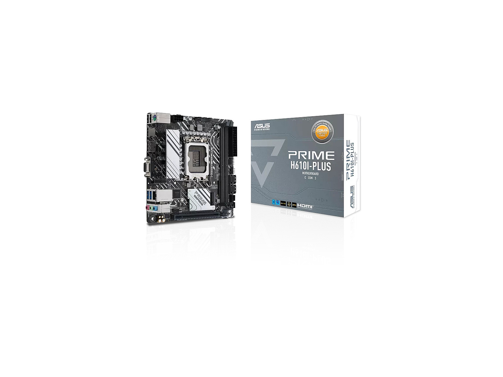 LongSummaryDescription - ASUS PRIME H610I-PLUS-CSM. Processor manufacturer: Intel, Processor socket: LGA 1700, Compatible processor series: Intel® Celeron®, Intel® Core™ i3, Intel® Core™ i5, Intel® Core™ i7, Intel® Core™ i9,.... Supported memory types: DDR5-SDRAM, Maximum internal memory: 96 GB, Memory slots type: DIMM. Supported storage drive interfaces: M.2, SATA III, Supported storage drive types: HDD & SSD. Ethernet interface type: Gigabit Ethernet. Component for: PC, Motherboard form factor: mini ITX, Motherboard chipset family: Intel