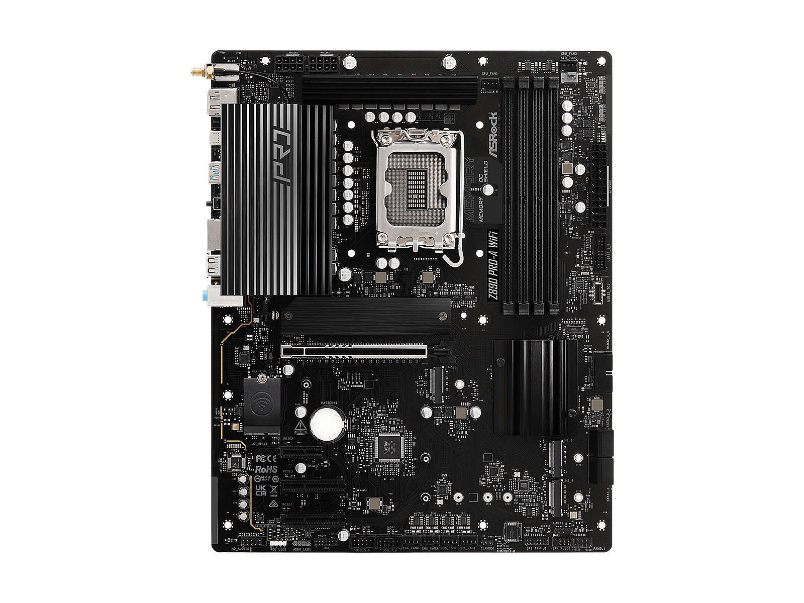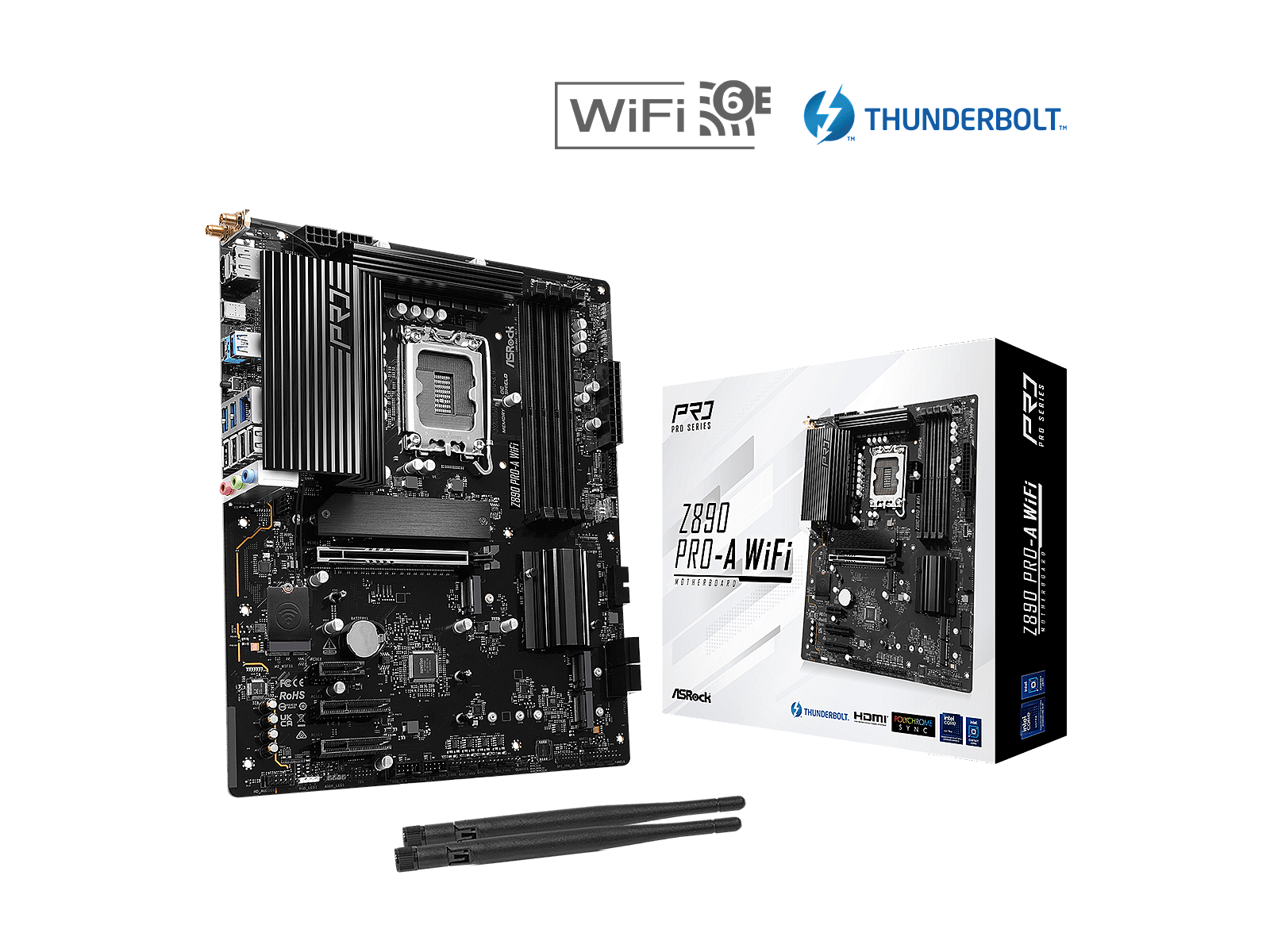 Description - Z890 Pro-A WiFi Supports Intel® Core™ Ultra Processors (Series 2)(LGA1851) 16+1+1+1+1 Power Phase, Dr.MOS for VCore+GT 4 x DDR5 DIMMs Supports Dual Channel, up to 9066+ (OC) 1 PCIe 5.0 x16, 2 PCIe 4.0 x4, 1 PCIe 4.0 x1 Graphics Output Options: 1 HDMI, 1 DisplayPort, 1 Thunderbolt™ 4 Type-C Realtek ALC897 7.1 CH HD Audio Codec 4 SATA3 1 Blazing M.2 (PCIe Gen5x4) 2 Hyper M.2 (PCIe Gen4x4) 1 Hyper M.2 (PCIe Gen4x4 & SATA3) 1 Thunderbolt™ 4 Type-C (Rear) 2 USB 3.2 Gen2x2 Type-C (1 Rear, 1 Front), 1 USB 3.2 Gen2 Type-A (Rear), 6 USB 3.2 Gen1 (2 Rear, 4 Front), 8 USB 2.0 (4 Rear, 4 Front) Realtek 2.5G LAN 802.11axe Wi-Fi 6E + Bluetooth Supports BIOS Flashback, Memory OC Shield, Durable Caps with 1000uF Capacitance This model may not be sold worldwide. Please contact your local dealer for the availability of this model in your region.