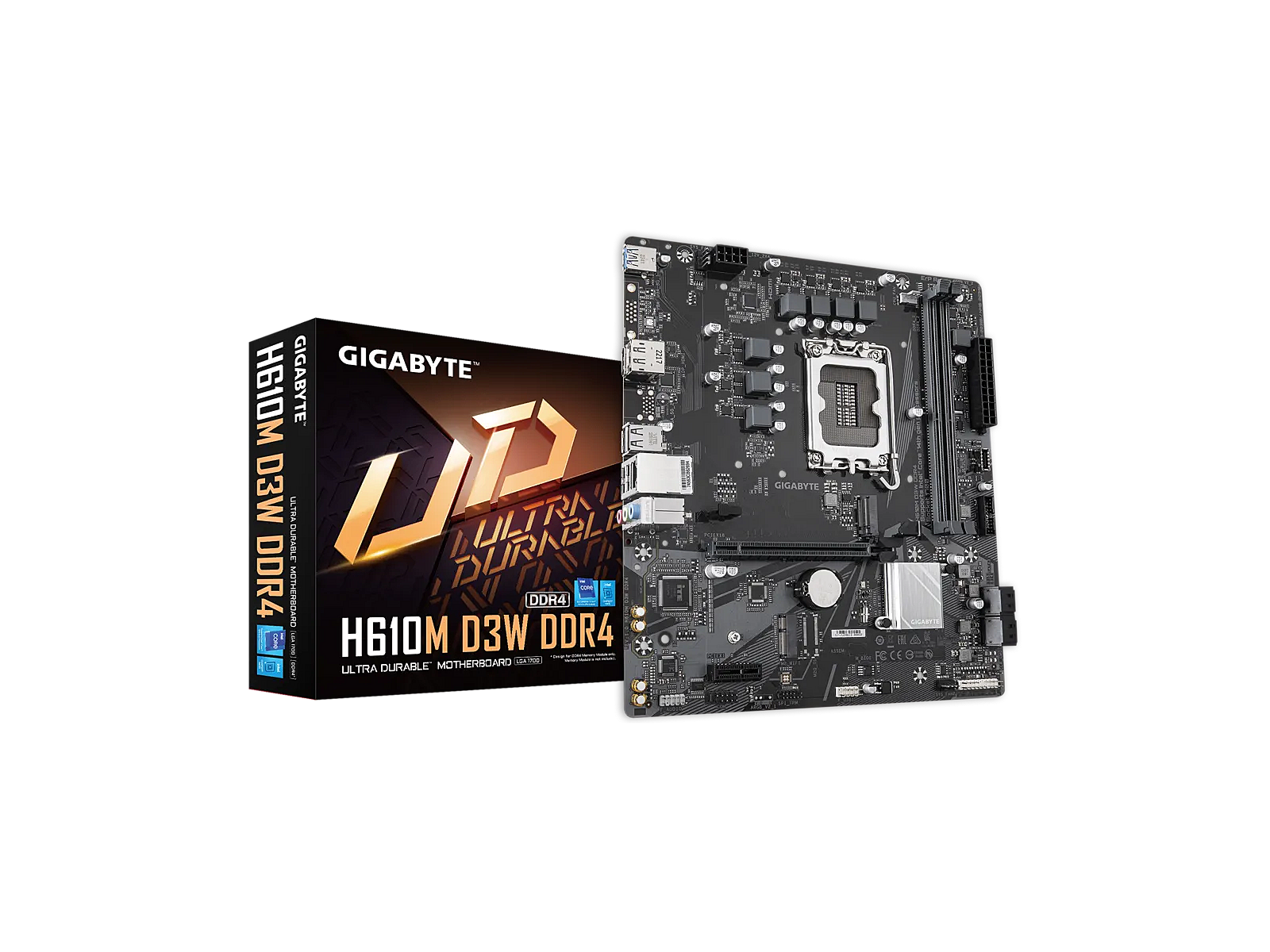 LongSummaryDescription - GIGABYTE H610M D3W DDR4 Motherboard - Supports 14th Gen. Intel Core CPUs, 5+1+1 phases VRM, up to 3200MHz DDR4, 1xPCIe 3.0 M.2, 1GbE LAN, USB 3.2 Gen 1. Processor manufacturer: Intel, Processor socket: LGA 1700, Compatible processor series: Intel® Celeron®, Intel Core i3 12th Gen, Intel Core i3 13th Gen, Intel Core i3 14th Gen, Intel.... Supported memory types: DDR4-SDRAM, Maximum internal memory: 64 GB, Memory slots type: DIMM. Supported storage drive interfaces: M.2, SATA III, Supported storage drive types: HDD & SSD. Ethernet interface type: Gigabit Ethernet, LAN controller: Realtek RTL8111H. Component for: PC, Motherboard form factor: micro ATX, Motherboard chipset family: Intel