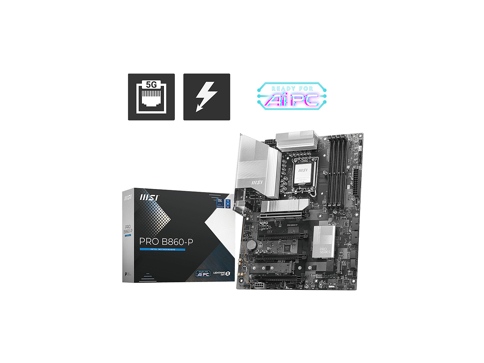 Description - PRO B860-P offers a simple design with a harmonious silver color scheme that perfectly matches both white and black PC builds. It is engineered with many exclusive features of MSI, 5G LAN, Thunderbolt 4, PCIe 5.0 M.2, and Supplemental PCIe Power, ready for the Intel® Core™ Ultra processors. Support Intel® Core™ Ultra Processors (Series 2) for LGA 1851 socketSupports DDR5 Memory, Dual Channel DDR5 8800+ MT/s (OC)Ultra Performance: 12+1+1+1 Duet Rail Power System with P-PAK, 8+4-pin CPU power connectors, Core Boost, Memory Boost, 6-layer server-grade PCBFrozr Guard: Extended Heatsink, MOSFET thermal pads rated for 7W/mK, additional choke thermal pads and EZ M.2 Shield Frozr II are built for high performance system and non-stop experienceEZ DIY: EZ M.2 Shield Frozr II, EZ M.2 Clip II, EZ PCIe Clip II and EZ AntennaLightning Fast Game experience: PCIe 5.0 slot and Lightning Gen 5 x4 M.2Thunderbolt™ 4 port and 5G LAN: the latest solution for professional and multimedia use, delivering secure, stable, and high-speed networking and data transmissionAudio Boost: Reward your ears with studio grade sound quality for the most immersive gaming experience