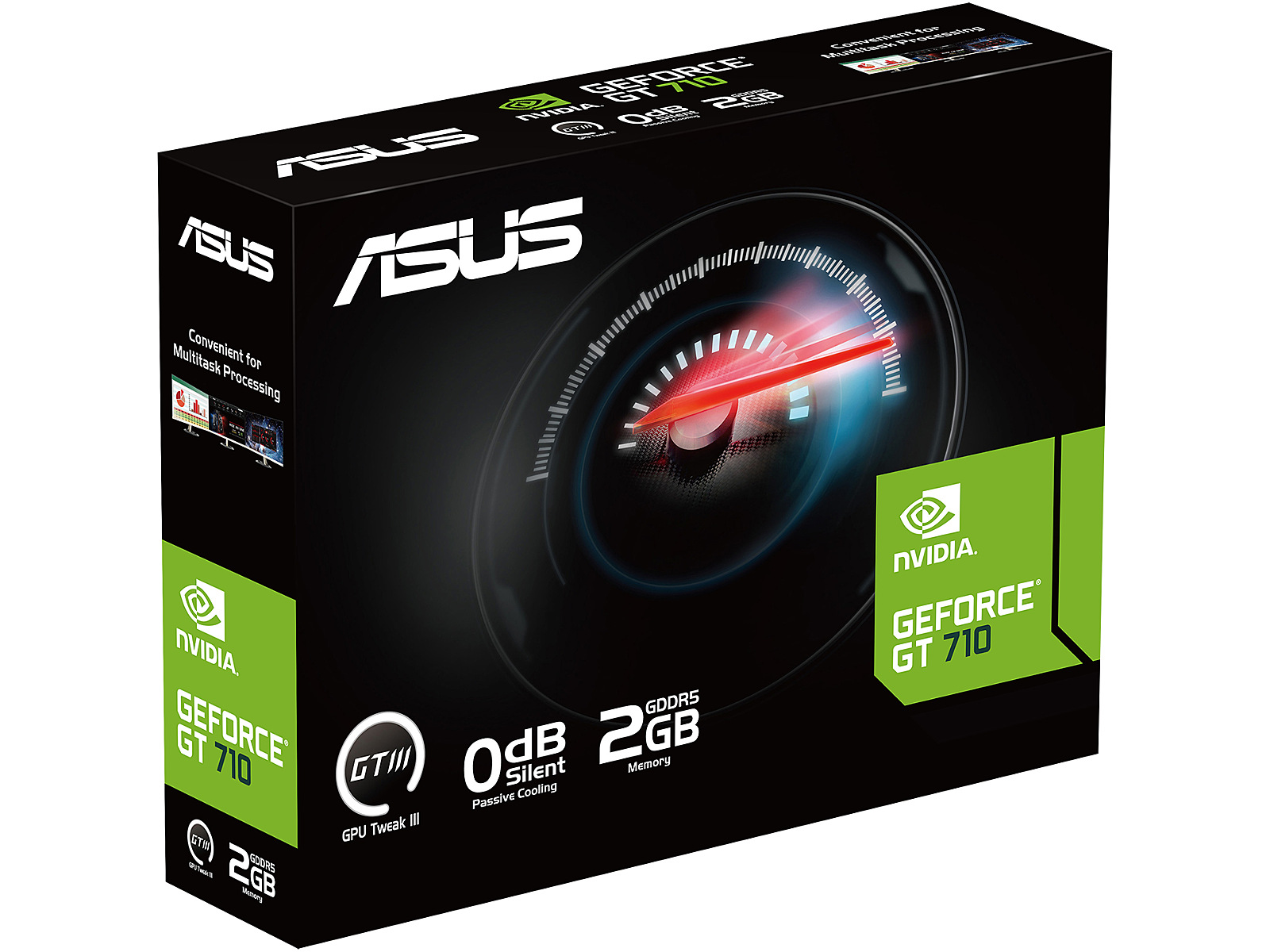 LongDesc - Big Productivity in a Small PackageThe ASUS GeForce® GT 710 is a passively-cooled graphics card that enables quiet multi-monitor productivity.Passive CoolingA passively-cooled design creates a quieter workspace.Supports 3 DisplaysASUS GeForce GT 710 is a compact graphics card with three outputs (HDMI, DVI and D-Sub) that can support up to three displays at the same time for convenient multitasking.GPU TWEAK IIIMonitor, tweak, and tuneASUS GPU Tweak III is more intuitive and feature-rich than ever before. A revamped interface offers greater accessibility by integrating core functions into a centralized dashboard, and our Voltage-Frequency tuner has been overhauled to make overclocking even easier. Additional goodies like 0dB fan technology, automatic profile swapping, a fully customizable on-screen display, and logging capabilities ensure that you get the most out of your graphics card.