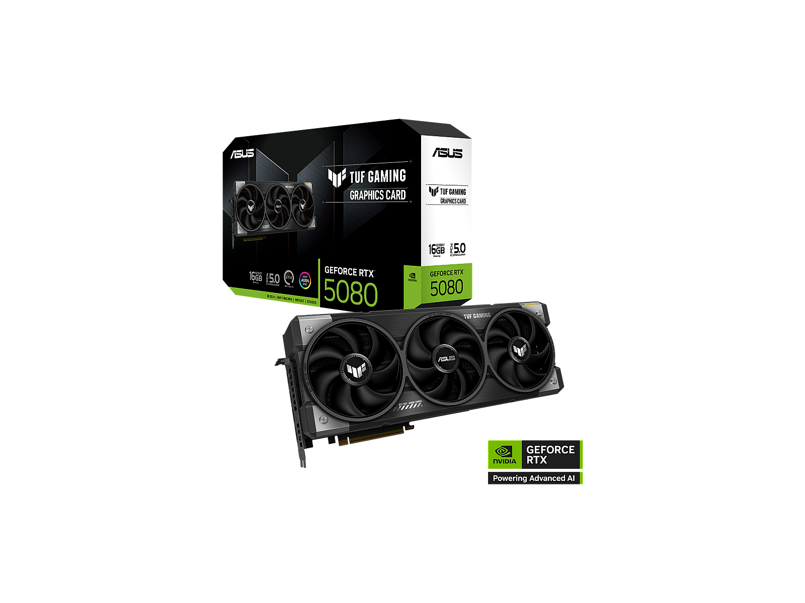 LongSummaryDescription - ASUS TUF Gaming TUF-RTX5080-16G-GAMING. Graphics processor family: NVIDIA, Graphics processor: GeForce RTX 5080. Discrete graphics card memory: 16 GB, Graphics card memory type: GDDR7, Memory bus: 256 bit. Maximum resolution: 7680 x 4320 pixels. OpenGL version: 4.6. Interface type: PCI Express 5.0. Cooling type: Active, Number of fans: 3 fan(s), Illumination colour: Multi