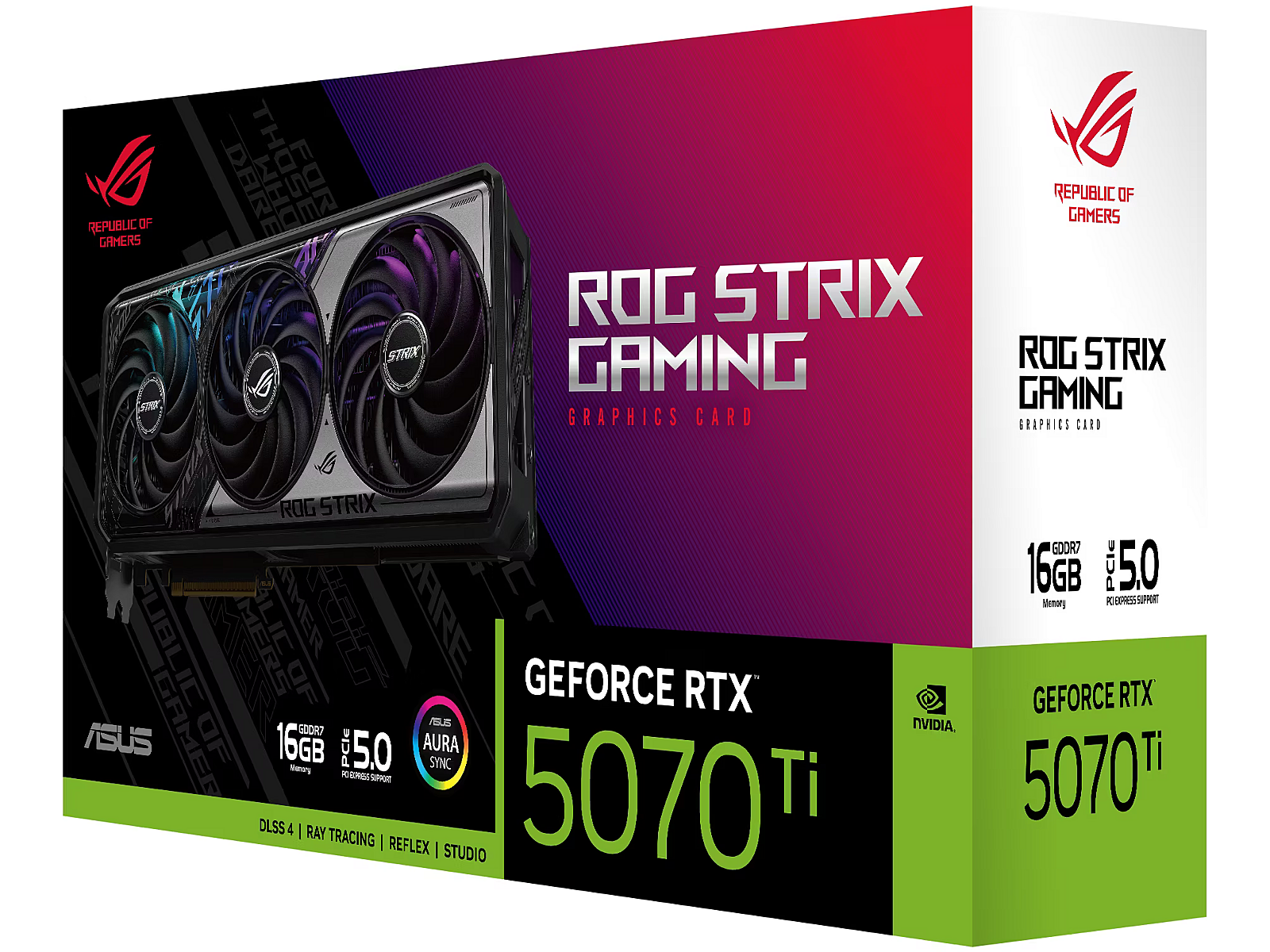 Summary - ASUS ROG -STRIX-RTX5070TI-O16G-GAMING. Graphics processor family: NVIDIA, Graphics processor: GeForce RTX 5070 Ti. Discrete graphics card memory: 16 GB, Graphics card memory type: GDDR7, Memory bus: 256 bit. Maximum resolution: 7680 x 4320 pixels. OpenGL version: 4.6. Interface type: PCI Express 5.0. Cooling type: Active, Number of fans: 3 fan(s), Illumination colour: Multi