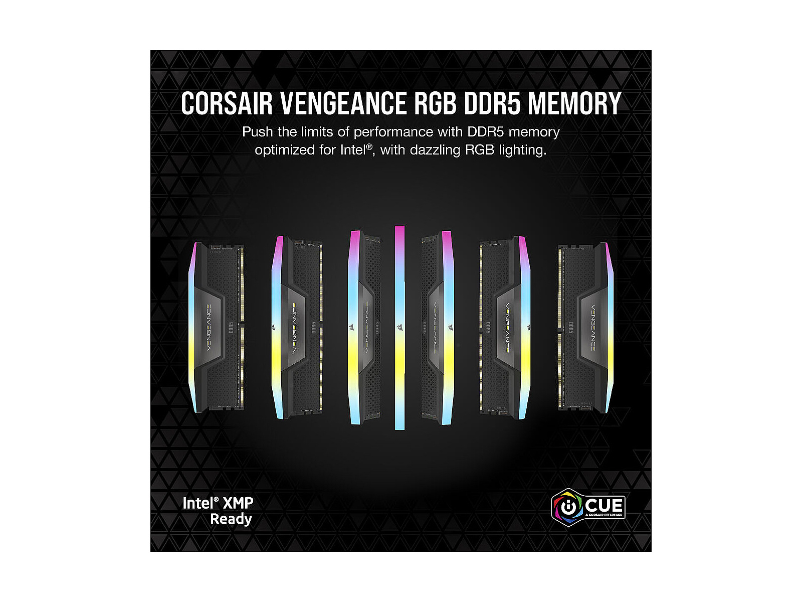 Description - DDR5 Vengeance RGB CORSAIR VENGEANCE RGB DDR5 memory delivers DDR5 performance, higher frequencies, and greater capacities optimized for Intel motherboards while lighting up your PC with dynamic, individually addressable ten-zone RGB lighting. Tightly screened highfrequency memory chips enable faster processing, rendering, and buffering than ever, with onboard voltage regulation for easy, finely controlled overclocking. Take control with CORSAIR iCUE software and enable RGB lighting customization, real-time frequency monitoring, onboard voltage regulation, and Intel XMP 3.0 profile customization. A custom PCB provides superb signal quality for high performance and stability on the latest Intel DDR5 motherboards. For cutting-edge DDR5 performance with mesmerizing RGB lighting, VENGEANCE RGB DDR5 lights the way.