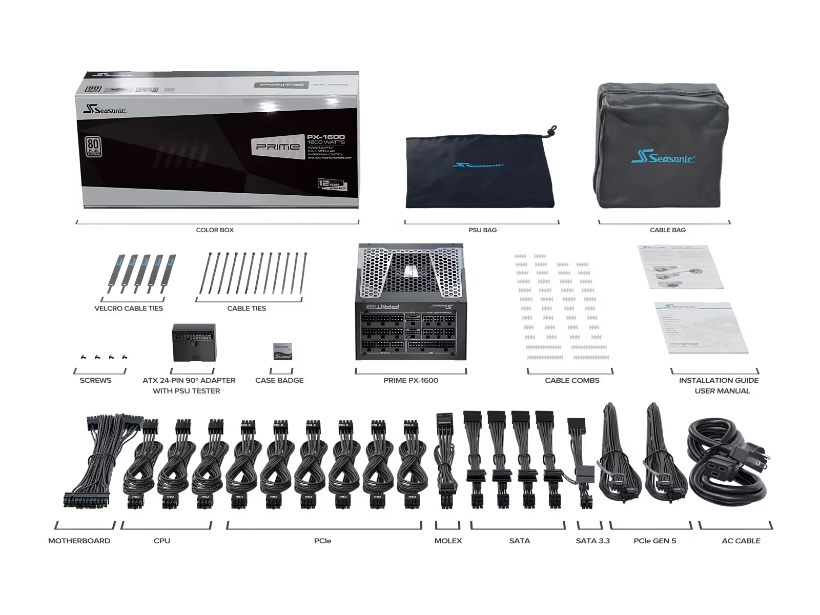 Summary - Seasonic ATX3-PRIME-PX-1600. Total power: 1600 W, AC input voltage: 100 - 240 V, AC input frequency: 50/60 Hz. Motherboard power connector: 20+4 pin ATX, Motherboard power cable length: 61 cm, Peripheral (Molex) power cable length: 690 mm. Purpose: PC, Power supply unit (PSU) form factor: ATX, 80 PLUS certification: 80 PLUS Platinum. Product colour: Black, Cooling type: Active, Fan diameter: 13.5 cm. Cables included: CPU, PCIe, Peripheral (Molex) to SATA 3.3, SATA
