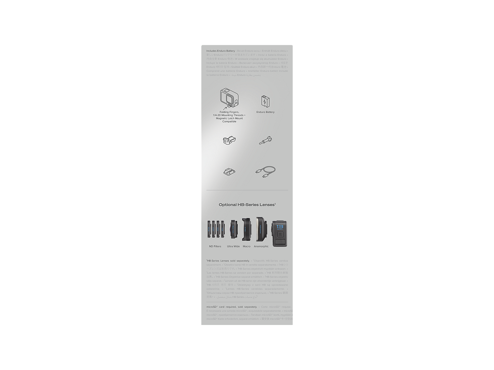 HERO13 Black — идеальный спутник для любого создателя контента. Помимо отличного качества видео 5.3K60 и легендарной прочности GoPro, он совместим с новыми объективами серии HB. Эти объективы расширяют возможности камеры благодаря потрясающим функциями — сверхшироким снимкам POV, экстремально крупным планам, размытию движения, созданному фильтрами ND, и кинематографическим анаморфным эффектам.