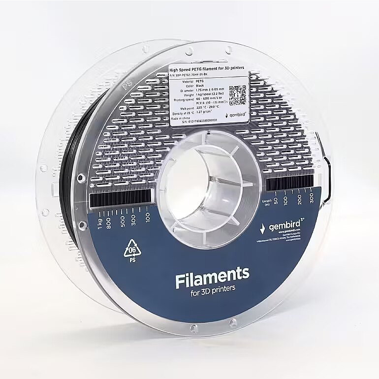 Description - PETG High Speed Filament, 1.75 mm, 1 kg, black Polyethylene terephthalate (PETG) is an amorphous thermoplastic from the polyester family. An ideal combination of clarity and strength. PETGs transparency is close to acrylic, while its impact resistance is similar to polycarbonate. Easy printing on various 3D printers. High-speed filament for fast printers such as Bambu Lab, Creality K1 (Max), FF 5M (PRO), and Voron. Perfectly compatible with the Bambu Lab Automatic Material System (AMS). Suitable for CoreXY machines. Printing at maximum speed in Sport and Ludicrous modes. Enhanced melt flow capability, enabling higher-speed printing. Very high-strength filament. Impact resistance PETG is less brittle than acrylic and is a more affordable alternative to polycarbonate. Chemical resistance offers excellent chemical resistance compared to many other transparent plastics. Environmentally friendly, as it is considered 100% recyclable. Very low shrinkage makes printing large, flat surfaces extremely easy. Easy printing on any acrylic, glass, Kapton, or other print bed platform.