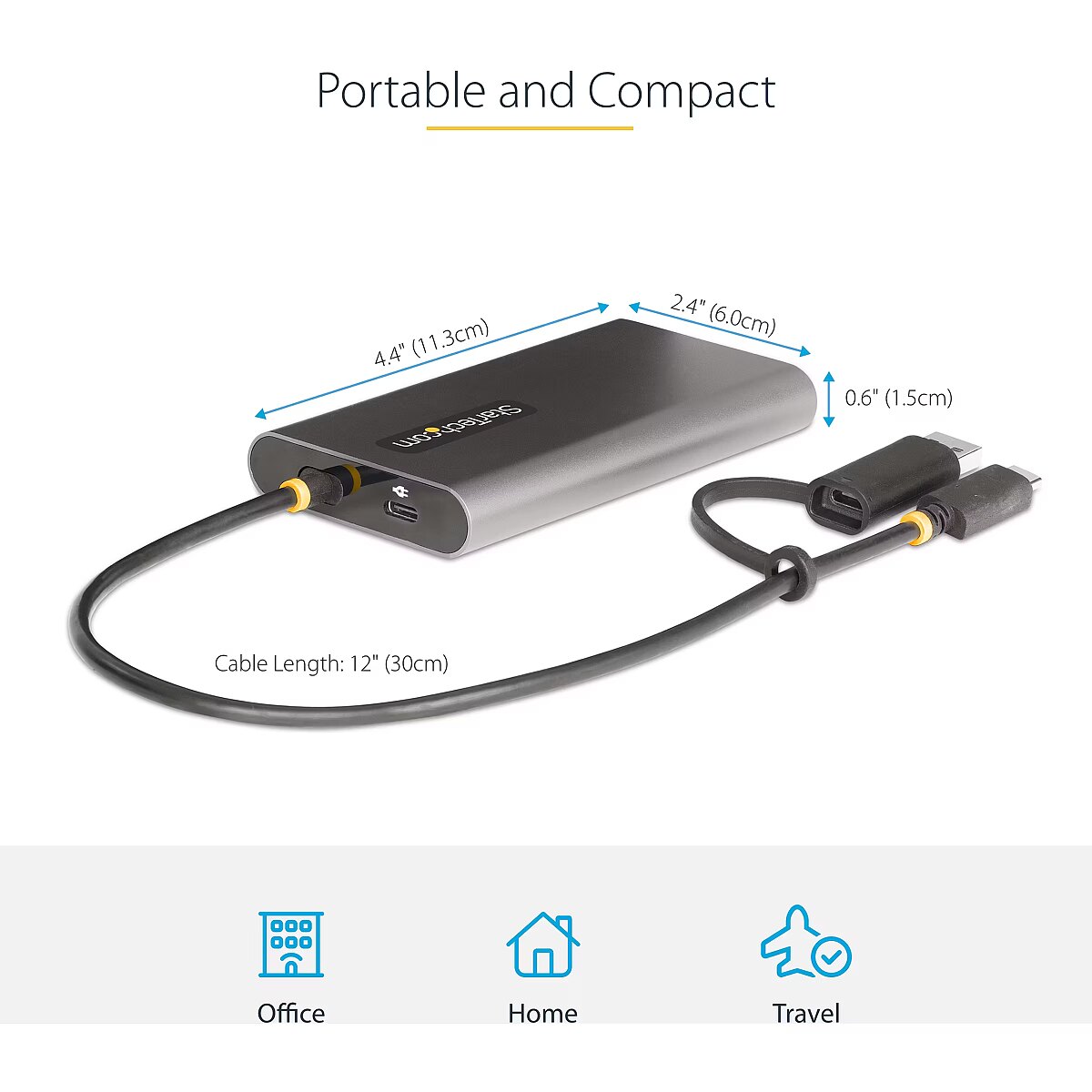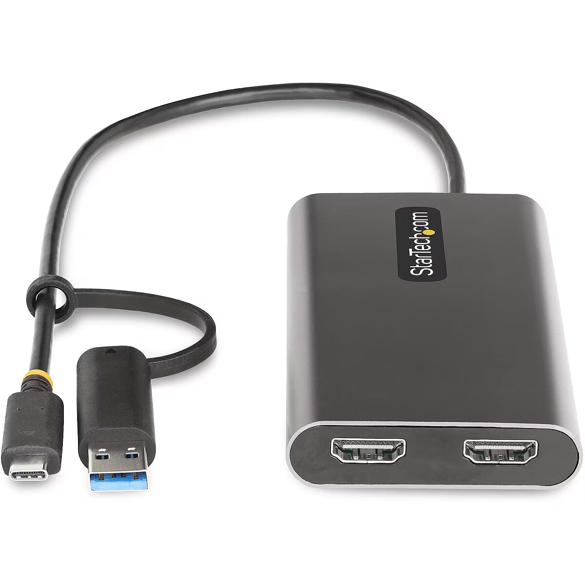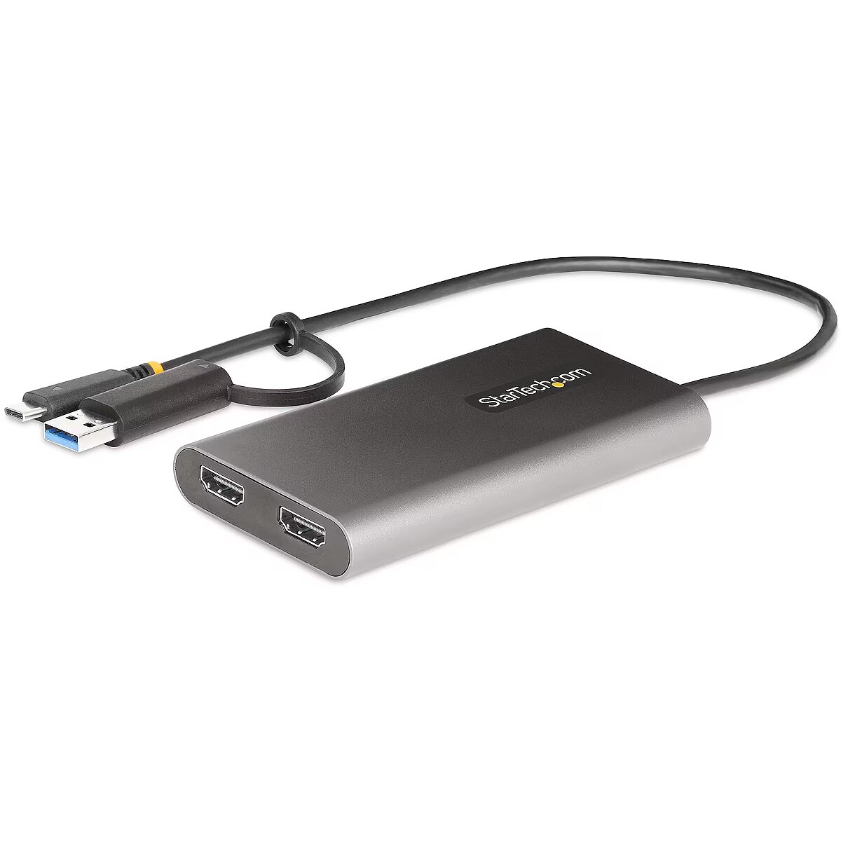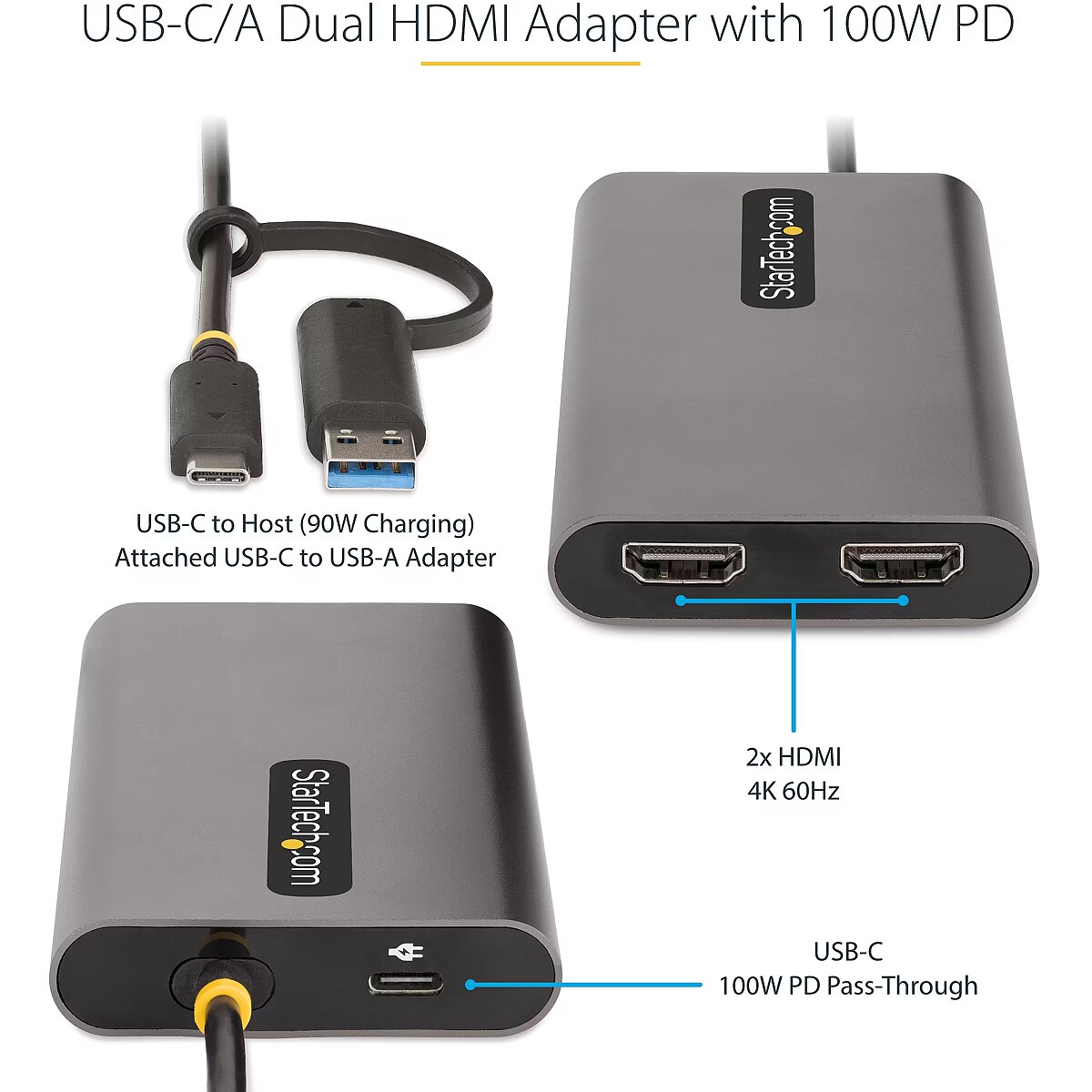 LongDesc - Dual 4K 60Hz HDMI Output | Attached USB-C to USB-A DongleConnect two 4K 60Hz HDMI displays to the USB Type-C or Type-A port of a laptop/desktop computer, using this USB-C to Dual-HDMI Adapter.Power Delivery Pass-ThroughThe USB video adapter features USB Power Delivery (PD) 3.0 pass-through (up to 100W), enabling powering and charging of a laptop when connected to a USB-C power adapter. The adapter runs on USB bus-power when no USB-C power adapter is connected. PD 3.0 features Fast Role Swap (FRS) that prevents USB data disruption when USB-C power is disconnected and the adapter switches to USB bus power.DisplayLink Certified 4K 60Hz ResolutionThe USB multi-monitor adapter is DisplayLink Certified and supports high-performance dual-monitor 4K 60Hz video resolutions with an integrated DisplayLink DL-6950 Controller.Comprehensive CompatibilityThe USB video adapter is compatible with Windows, macOS, Ubuntu, and Chrome OS. The integrated USB-C to USB-A adapter enables the flexibility of connecting to any host that is running a compatible operating system. The built-in 1ft (30cm) USB-C/A cable is ideal for on the go use. The length of the cable and the strain reliefs reduce connector/port strain.This product is backed for 3-years by StarTech.com, including free 24/5 multi-lingual technical assistance.The StarTech.com Advantage