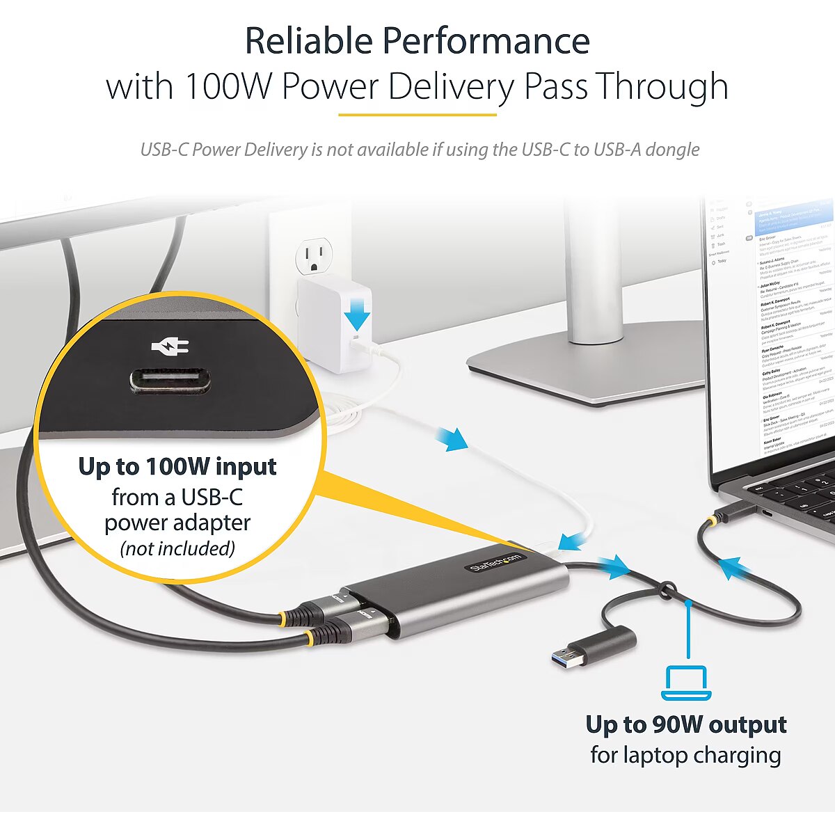 ShortSummaryDescription - StarTech.com USB-C to Dual-HDMI Adapter - USB-C or A to 2x HDMI - 4K 60Hz - 100W Power Delivery Pass-Through - 1ft (30cm) Built-in Cable - USB to HDMI Multi-Monitor Converter for Laptop - TAA, 3.2 Gen 1 (3.1 Gen 1), USB Type-C, HDMI output, 3840 x 2160 pixels