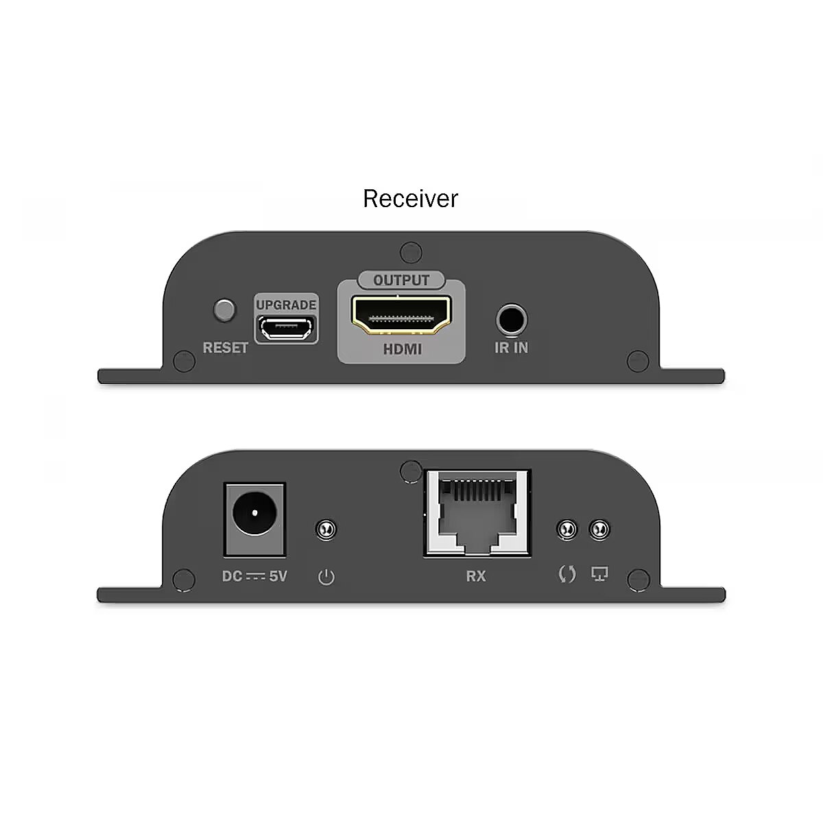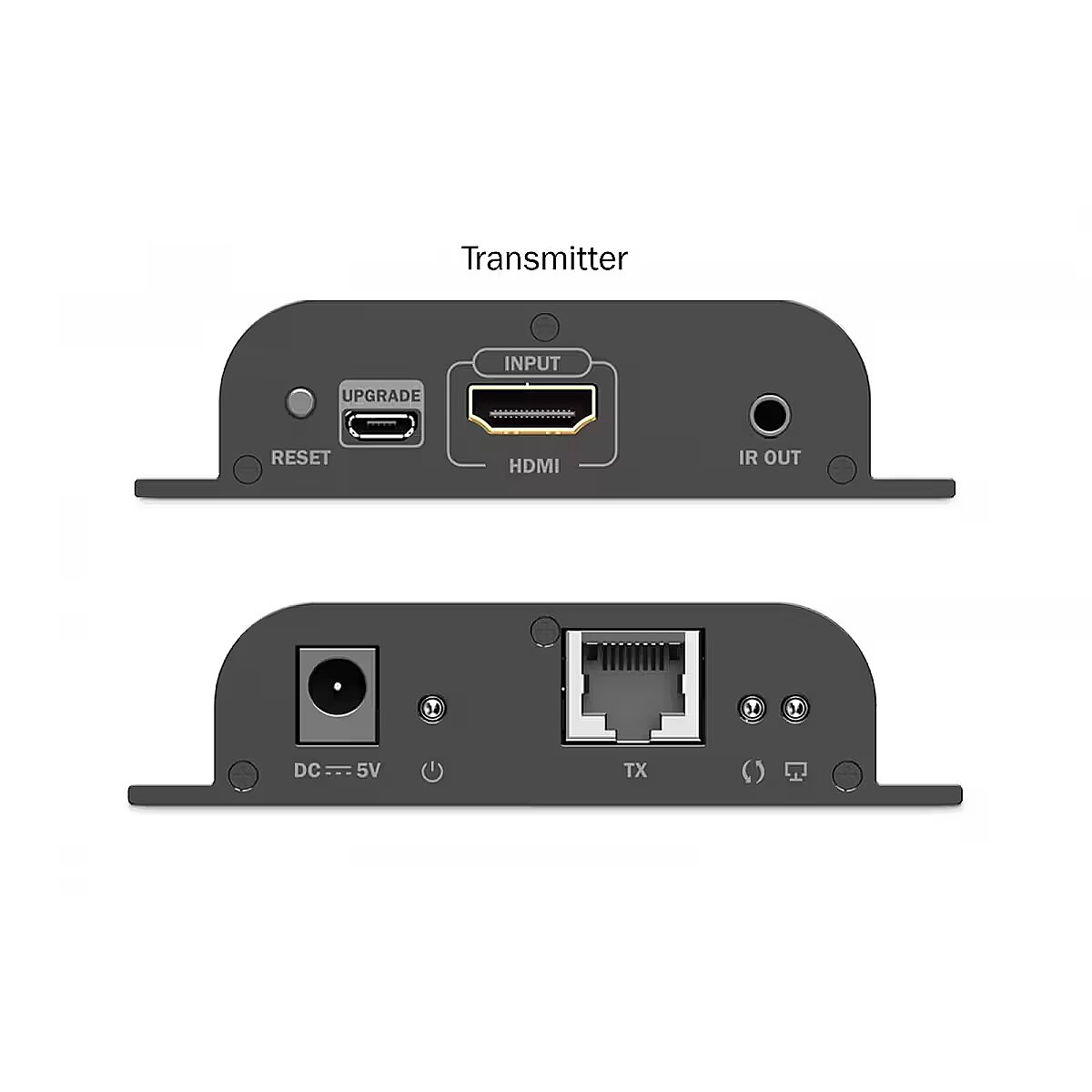 Other features - Transmitter (TX) connections: 1× HDMI input (4K/60Hz) - connect signal source 1× RJ45 output (Gigabit Ethernet) - connect to CAT cable 1× IR output - for IR signal transmission 1× Power connector (DC 5V/1A) - external power input 1× Micro USB - firmware update port 1× Reset button 3× Status LEDs Receiver (RX) connections: 1× HDMI output (4K/60Hz) - connect display 1× RJ45 input (Gigabit Ethernet) - connect CAT cable 1× IR input - receive and forward IR signal 1× Power connector (DC 5V/1A) - external power input 1× Micro USB - firmware update port 1× Reset button 3× Status LEDs Performance: Maximum resolution: Ultra HD 4K/60Hz (4096×2160p) Maximum point-to-point distance: 200 m Maximum point-to-multipoint distance: 120 m Maximum cascade distance per section: 120 m Supports Cat6 or higher network cables HDMI 2.0 HDCP 2.2 / 1.4 Maximum video bandwidth: 18 Gb/s Latency: 150-220 ms (4K/60Hz), 80-130 ms (Full HD) Additional features: Wall-mountable Supports up to 253 receivers Protections: short circuit, surge, ESD (electrostatic discharge) Operating temperature: -20° - 60° C Power consumption: TX ~3.5 W, RX ~2.5 W Housing: metal