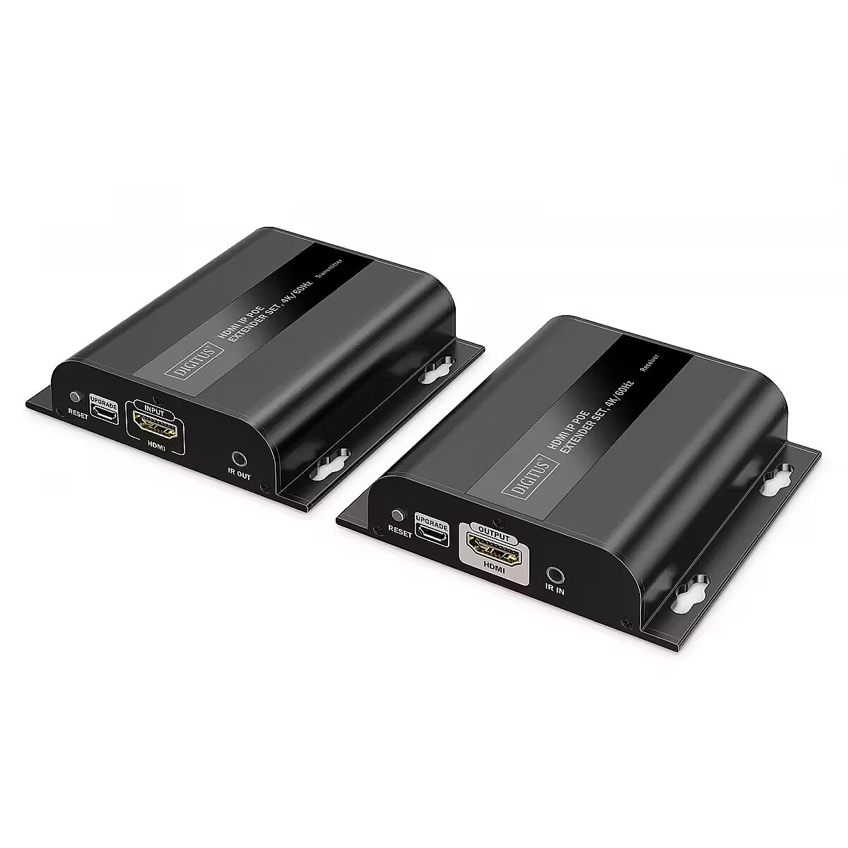 Description - Extender HDMI IP/Cat.5/6/7 120m 4K 30Hz UHD PoE HDCP 1.4 IR audio (receiver) Use additional receiver units (DS-55125) and your existing network infrastructure or additional PoE switches to display video contents on up to 253 screens (point-to-multipoint connection) Power supply through PoE switch - no external power supply required Supports CAT 5, CAT 5e, CAT 6 and CAT 7 network cables Supports 4K (30 Hz), 3840 x 2160p resolution HDMI bandwidth: 10.2 Gbit/s (max.) HDCP version: 1.4 The 4K HDMI extender set (DS-55124) contains a transmitter unit and a receiver unit. The units do not require external power supply, they are powered by an additional PoE switch. Additional PoE switches or the existing infrastructure allows the HDMI signal to be extended over an unlimited distance (IP connection). Additional receiver units (DS-55125) allow video contents to be displayed on up to 253 screens. Use your existing network infrastructure or additional PoE switches (point-to-multipoint connection) for this purpose. 4K video contents can be displayed at a distance of up to 120 meters with a single point-to-point connection (power supply required). Put displays and TVs wherever you like, no matter where the output source is.