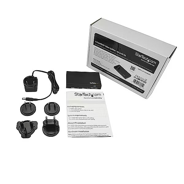 LongSummaryDescription - StarTech.com 2-Port HDMI Splitter with HDR - 4K 60Hz. Video port type: HDMI, Video out: 2x HDMI. Maximum resolution: 3840 x 2160 pixels, Product colour: Black, Supported graphics resolutions: 1280 x 720 (HD 720), 1920 x 1080 (HD 1080), 1920 x 1200 (WUXGA), 2560 x 1600 (WQXGA), 3840 x 2160. AC input voltage: 100 - 240 V, Input current: 0.2 A, Output voltage: 5 V. Dimensions (WxDxH): 56 x 100 x 17 mm, Weight: 159 g. Package width: 55 mm, Package depth: 100 mm, Package height: 16 mm