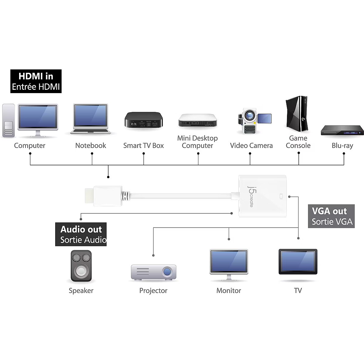 LongDesc - The JDA213 HDMI™ to VGA adapter allows you to connect the HDMI™ output from your laptop, Ultrabook™, desktop, tablet, Blu-ray™, DVD player, digital set-top box, digital camera, video camera, or gaming console equipment to the VGA input of a monitor or projector by converting the HDMI™ video signal from the output device into a VGA output and separate 2-channel analog audio. The adapter supports resolutions including high definition 1080p, up to 1920x1200, which eliminates the expense of upgrading a VGA display for the sake of compatibility. The adapter can also increase your productivity by extending your computer's desktop onto a secondary monitor, doubling available workspace. This adapter has a high quality, compact design for long-term durability and a minimal footprint. Once you’ve experienced multiple monitors, you’ll never want to go back to a single monitor again.