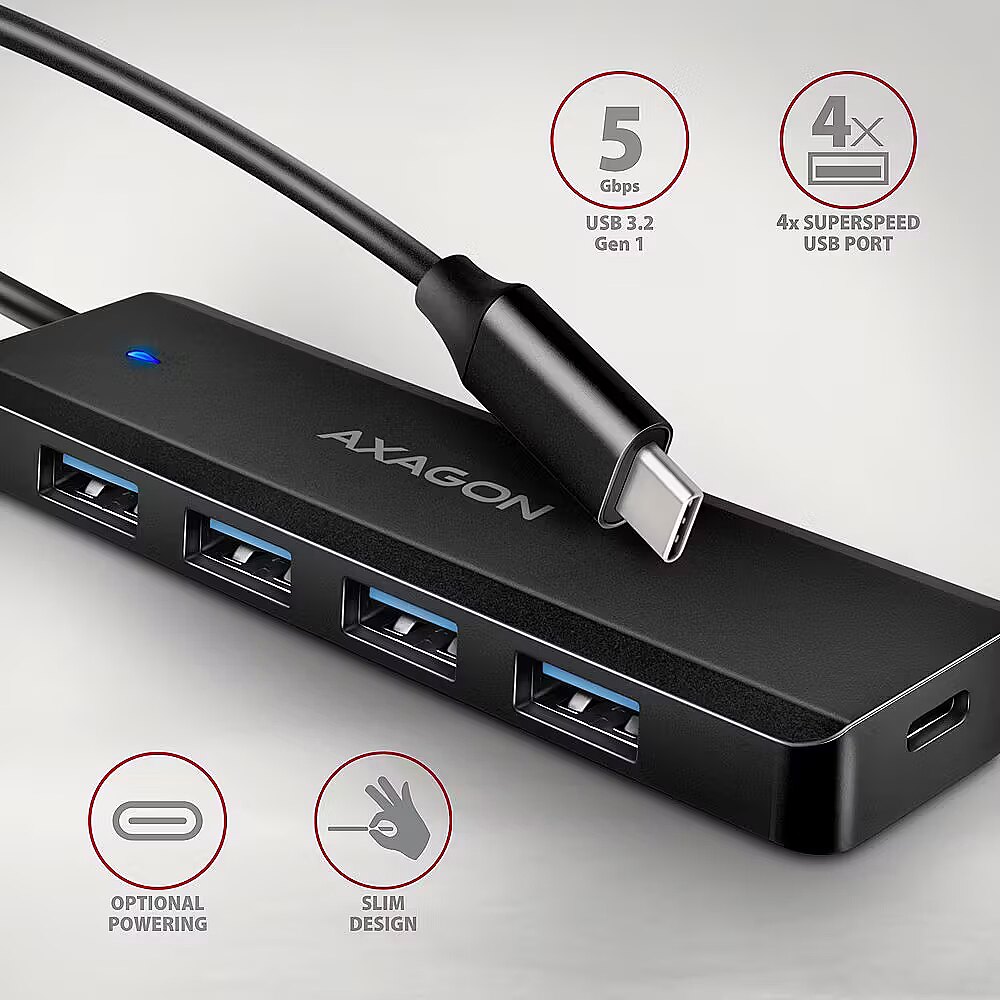 LongDesc - Travel USB-C 5Gbps hub AXAGON HUE-C1C fast and easy connects up to four USB devices to laptop or computer at the same time. Fixed 19 cm long USB-C cable is ideal for mobile devices users. The USB 3.2 Gen 1 standard enables transfer speeds of up to 5 Gb/s.The versatility of this compact USB hub is also enhanced by the built-in USB-C connector for additional power from standard USB chargers supplied with mobile phones. Thanks to this additional power supply several external disks or increase the number of mobile phones you can charge. Even without an external power supply, the hub can handle the permanent connection of several external drives.The hub also enables charging of phones and tablets with a current of up to 1.5A/5V, so you can easily charge e.g. Android smartphone, Apple iPhone, Apple iPad etc.The hub does not even frighten to connect with phones using the appropriate OTG or USB-A > USB-C adapter. You can connect a flash drive, keyboard and mouse to your phone or tablet.Input: • USB 5Gbps (USB 3.2 Gen1 / USB 3.0).• Backward compatible with USB 480Mbps (USB 2.0) and USB 1.1. • Connecting USB type C male connector on a fixed 19cm long cable.Outputs:• 4x USB 5Gbps, USB-A female connector.• Supported transmission rates 5.000 / 480 / 12 / 1.5 Mbps.• The total bandwidth / transfer rate of the box is given by the used USB 5Gbps interface (theor. up to 5 Gbit/s).Features:• Possibility to connect your device while running thanks to the Hot Plug support.• Full Plug and Play support.• Standby mode support.• High quality shielded cable ensures fast communication speed and minimal unwanted interference.• Decently bright LED indicates the connection of the hub to the computer.• Dimensions 106 x 32 x 11 mm.• Weight 37 g (incl. cable).• USB cable length 19 cm.The hub power mode via USB cable (bus power):• USB power is sufficient to connect low-power USB devices (mouse, keyboard, card reader, flash drive, etc.) or self-powered (printer, scanner, 3.5" external drive) to all four ports.• In this power mode, the USB hub is also able to work with up to 2 magnetic 2.5" external disks simultaneously.• Charge mobile devices (including iPad) with current up to 1A in each of the hub ports.The hub power mode via USB + external USB charger (self power):• Integrated USB-C connector in the body of the hub for additional power supply of the hub.• Any mobile device wall charger (not included) with USB-C connector can be used (recommended output current of the charger min. 2A).• In this power mode, the USB hub is able to work with three magnetic 2.5" external disks. Recommended for connection to smartphones and tablets.• Charge mobile devices (including iPad) with current up to 1.5A in each of the hub ports.Supported OS:• Windows 8.1 / 10 / 11 and later,• Windows Server 2012 R2 / 2016 / 2019 / 2022 and later,• Mac OS X 10.x and higher,• Linux with kernel 2.6.x and later,• Android most versions.Package contains:• USB-C hub with fixed 19 cm long cable,• multilingual guide CZ / DE / DK / ENG / ESP / FIN / FR / GR / HR / HU / IT / NL / PL / PT / RO / RU / SK / SWE / TR / BG / CN / ARA,• packed in a cardboard box with a hanging hole.