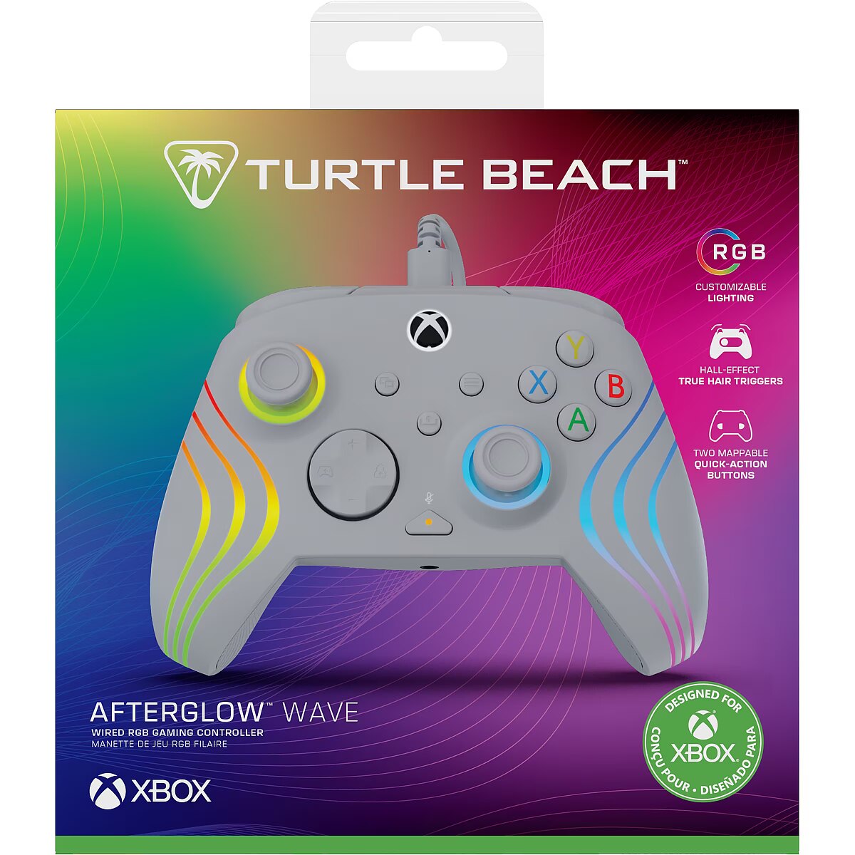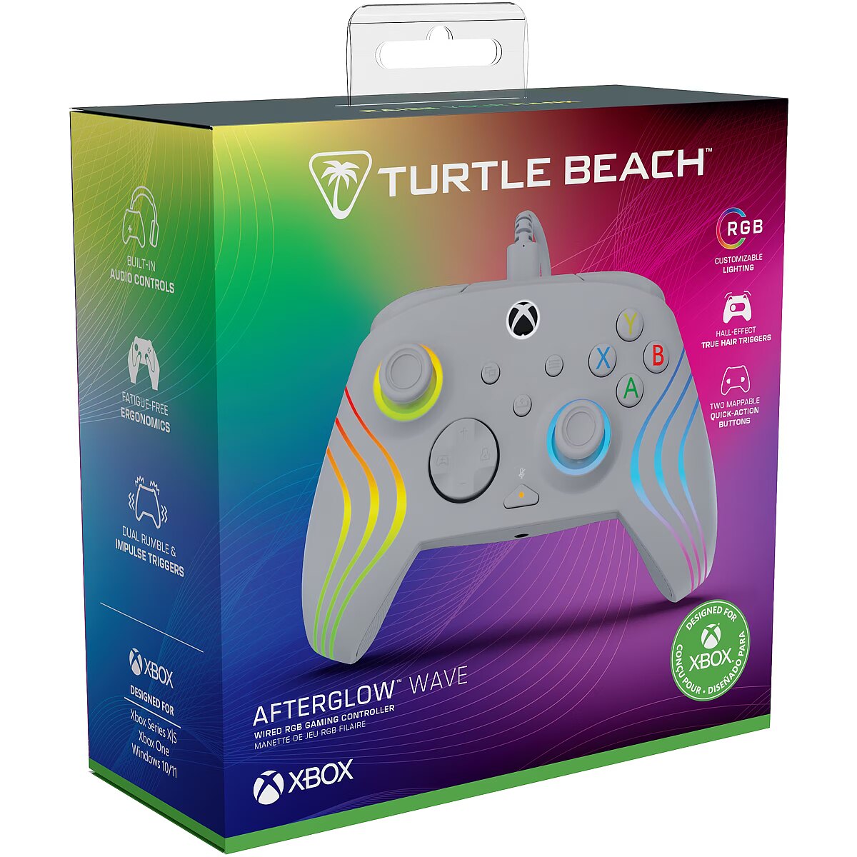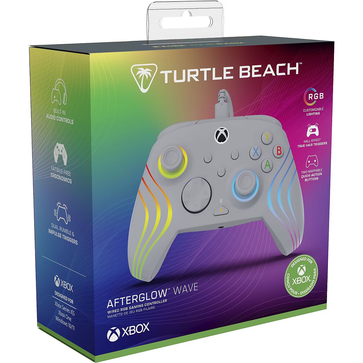 LongDesc - Unlock elevated gaming performance and style with the Turtle Beach® Afterglow™ Wave RGB gaming controller for Xbox Series X|S, Xbox One and Windows 10 & 11 PCs. Featuring Hall-Effect 3-stop adjustable triggers, you can fine-tune trigger sensitivity and enjoy smooth, precise, and durable control. Customize your controller’s style with intelligent RGB lighting, offering eight unique lighting zones and eight different preset modes with adjustable brightness. Customize your gameplay with two mappable quick-action buttons, keeping essential commands within close reach. Stay locked in with patented D-pad audio controls at your fingertips, allowing for instant adjustments to game/chat volume mix and master volume, plus a dedicated mic mute button. Download the Control Hub companion app for Xbox consoles & Windows PCs giving you advanced customization options for lighting, button mapping, as well as controller configuration and diagnosis. Dual rumble motors and impulse triggers provide immersive, responsive feedback, and an ergonomic shape with laser-etched textured grips ensures a fatigue-free feel. Officially licensed for Xbox and PC, the controller’s 10ft USB-C wired connection ensures reliable, lag-free gaming.