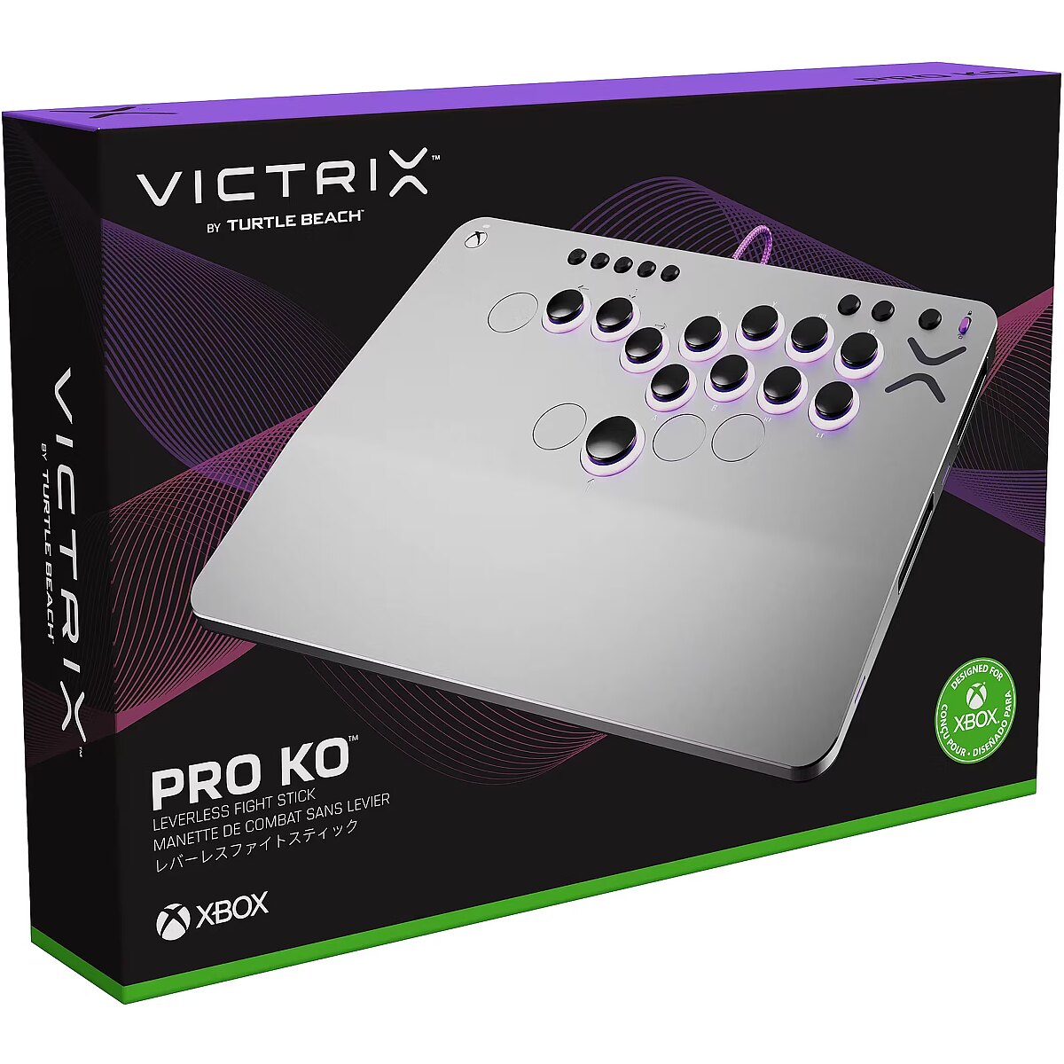 LongDesc - Knock out the competition with the fully customizable Xbox officially licensed Victrix™ Pro KO™ Leverless Fight Stick. Ensure precise hits with reliable and hot swappable Cherry MX Speed Silver RGB switches, ideal for clutch moments. Designed to fit your play style, the Pro KO™ includes customizable lighting, 16 moveable and mappable buttons, cable and button organizers for easy transportation, plus a control bar for swift adjustments. For those who love to mod, you’ll appreciate the removable aluminum top plate allowing you to adjust button positions or change to your preferred switches. Elevate your gaming and compete at a professional level today. FULLY CUSTOMIZABLE TO FIT YOUR STYLEWith a removable aluminum faceplate, you can easily remap or move up to 16 buttons to build your own layout. The hot swappable Cherry MX Speed Silver RGB switches are also easy to replace to fit your gaming style.TOURNAMENT READYPacked with all features required by the Pros, including a Tournament Lock Switch to avoid DQs, a lock mechanism for your 3m braided USB-C cable, and an ergonomic 6.28° wrist slope for all-day comfort.BUILT WITH THE PROS FOR THE PROSThe patent-pending 16 mappable and moveable button layout for the Pro KO was optimized by legendary fighting game champion Momochi to provide the best gaming experience possible.MILLIONS OF COLOR COMBINATIONSBlow away the competition with a beautiful display of RGB light rings around the buttons. Customize directly on the Pro KO with millions of additional color combinations and lighting modes using the free Victrix Control Hub app.TRAVEL MADE EASYTravel with ease with the Pro KO’s premium slim design, fitting comfortably in your backpack or carried over your shoulder with a strap attached to the built-in strap bars.