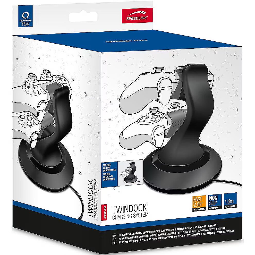 description_en - Charge your PS4 controllers quickly and reliably with the TWINDOCK charging system. Charge up to two controllers simultaneously and save the hassle of waiting. The proven, convenient docking system also holds your controllers securely in place – simply dock them and they′ll start charging instantaneously. The rubberised feet prevent the charging system from sliding around, so it always stays rooted to the spot. What′s more, besides the stylish design the TWINDOCK Charging System is highly durable as it’s designed for daily use. Thanks to its compact size and the practical arrangement of the charging slots, you can use the charging station wherever you want – plus, you′ll always have your controllers and PS4 gamepads ready to hand and neatly arranged. Stylish charging station for DUALSHOCK®4 controllers Convenient charging station for two controllers Stylish design AC adapter included Charges one or two controllers Charging time: approximately 2.5 hours Controllers simply slot in Charging station stays rooted to the spot Cable length: 1.5 m