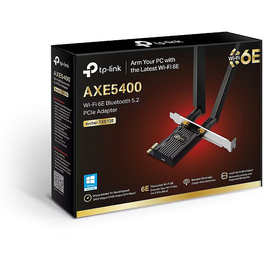 LongDesc - Better Performance WiFi 6EWiFi 6E means WiFi 6 extended to the 6 GHz band, a newly-opened frequency band that adds more bandwidth, faster speeds, and lowerlatency. This opens up resources for future innovations in AR/VR, 8K streaming, and more.Blazing Fast forLatency Free StreamingArcher TXE72E arms your PC with the newly opened 6 GHz band, unlocking your WiFi 6E router’s full potential. Enjoy unimpeded streaming on the 6 GHz band—exclusive to WiFi 6E devices. This prevents drops in speed and interference from legacy devices.Superior WiFi ReceptionArcher TXE72E brings your PC’s WiFi reception to the next level with the revolutionary combination of OFDMA and MU-MIMO. This ensures the efficiency of your PC’s WiFi connection by allowing more devices to communicate with your router simultaneously, rather than waiting in turn for data.Immersive Game World with Lower LatencyLower latency is key to seamless experiences in real-time applications like video conferencing and gaming. To achieve this, Archer TXE72E reduces lag by up to 75% with the Intel Wi-Fi 6E chipset.High-Gain Antennas for Broader CoverageTwo powerful signal-boosting high-gain antennas greatly extend existing Wi-Fi coverage, offering a fast, smooth online experience from farther away.The Latest Bluetooth 5.2Coordinate your game controllers, headphones, and keyboards with the latest Bluetooth standard. Archer TXE72E equips your PC with Bluetooth 5.2, which achieves faster speeds and broader coverage.Your Security GuardThe latest WiFi security protocol, WPA3, brings new capabilities to improve cybersecurity. More secure encryption in WiFi password safety and enhanced protection against brute-force attacks combine to safeguard your home network.Easy SetupSimple software installation via disk with the intuitive UtilityLow-Profile BracketIn addition to the standard bracket, a low-profile bracket is also provided for mini tower computer casesOperating SystemSupports Windows 10, 11 (64-bit)