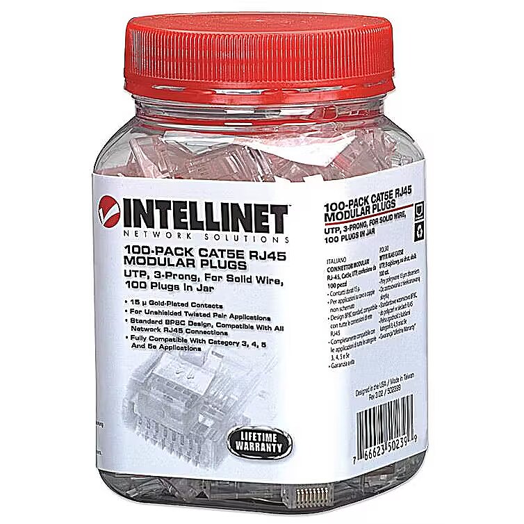 ShortSummaryDescription - Intellinet RJ45 Modular Plugs, Cat5e, UTP, 3-prong, for solid wire, 15 µ gold plated contacts, 100 pack, RJ-45, Transparent, Polycarbonate, Cat5e, U/UTP (UTP), Gold