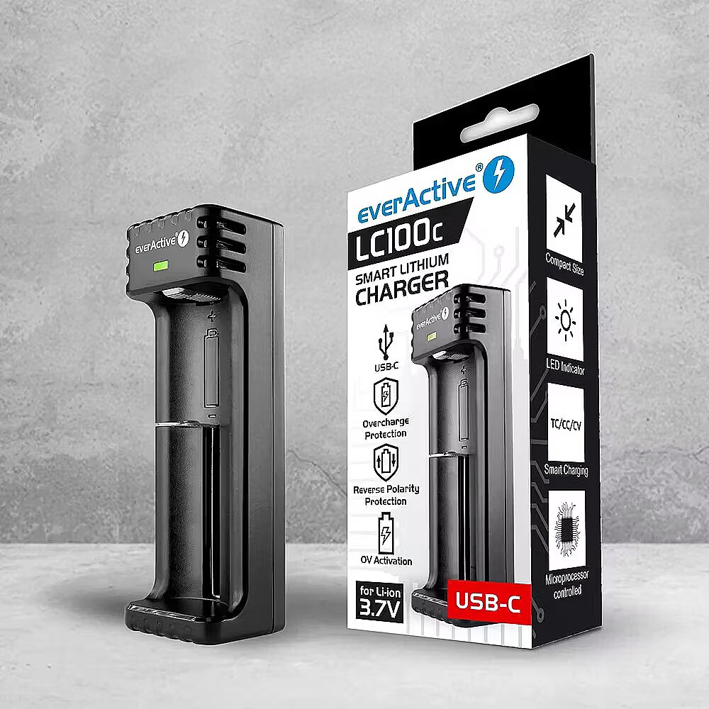 Apraksts - EverActive LC-100C ir vienkāršs, taču ļoti uzticams viena elementa/akumulatora lādētājs. Ierīcē tiek izmantots mikroprocesors, kas kontrolē uzlādes procesu. Šajā segmentā lādētājs izceļas ar salīdzinoši lielu maksimālo uzlādes strāvu - 1000 mA. LC-100C lādētājs ļauj uzlādēt tipisku 18650 2200 mAh akumulatora elementu tikai 2,5 stundās.