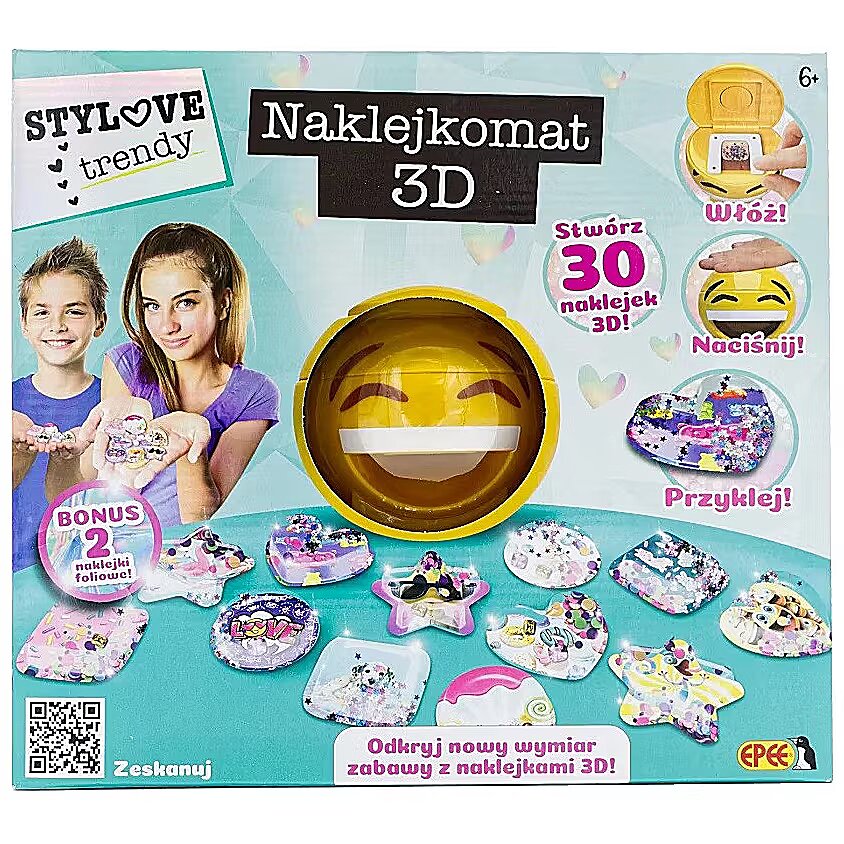 Dane techniczne: Załączone wyposażenie - maszynka do tworzenia naklejek, 30 nakładek, 30 plastikowych foremek, 30 kolorowych szablonów, brokatowe ozdoby, diamenciki i posypka, instrukcja