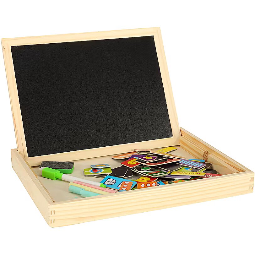 description_en - Double-sided wooden board with magnetic puzzles for arranging pictures.