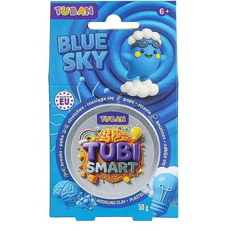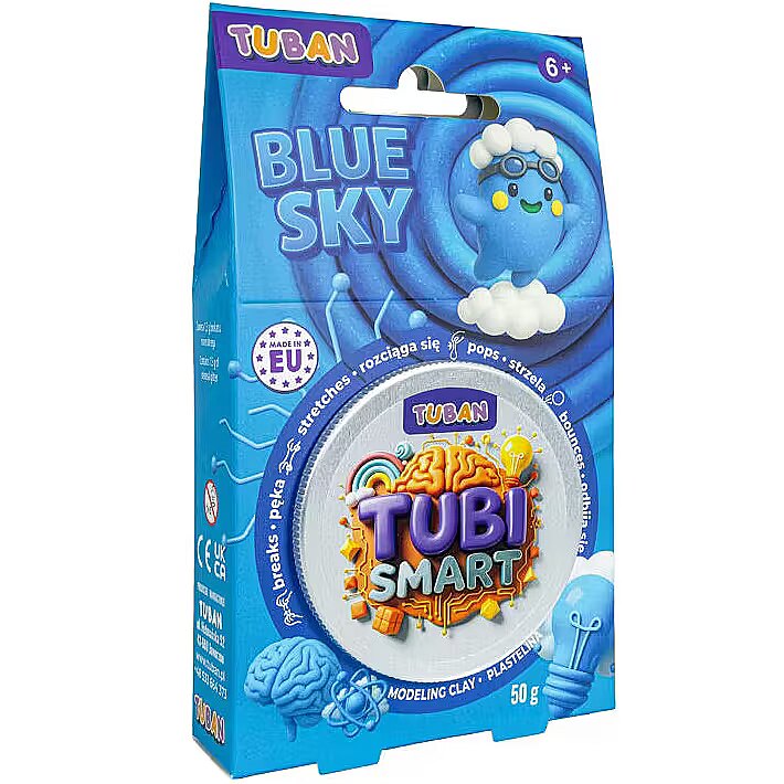 Description - Tubi Smart Playdough - Blue Sky 50g Discover a modeling clay in a unique blue color, to which you can add white beads for even more fun. This extraordinary clay stretches, breaks, and bounces, bringing loads of joy with every touch! You can knead it, shape it, and experiment with endless new ways to play-only your imagination sets the limit. When playtime is over, simply store the clay in a sealed jar to enjoy its amazing properties for a long time. MADE IN POLAND.