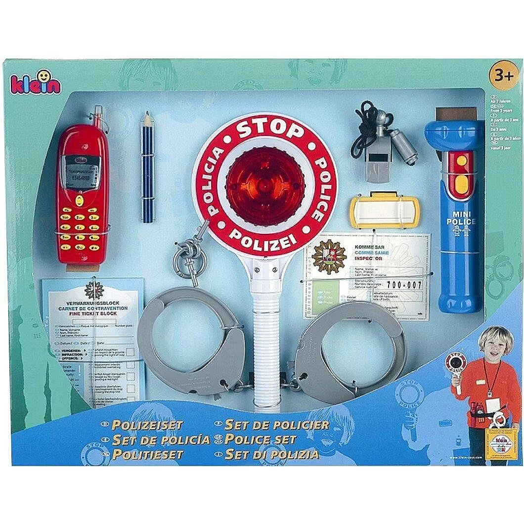 Description - Police set from Klein consisting of 10 pieces, including handcuffs, torch and glowing police lollipop.