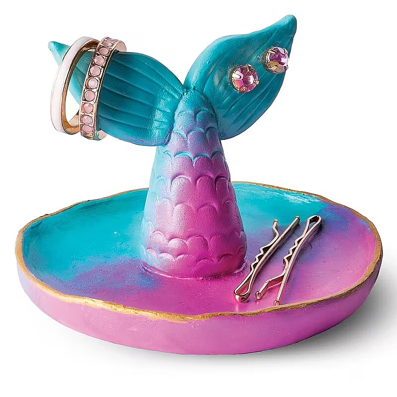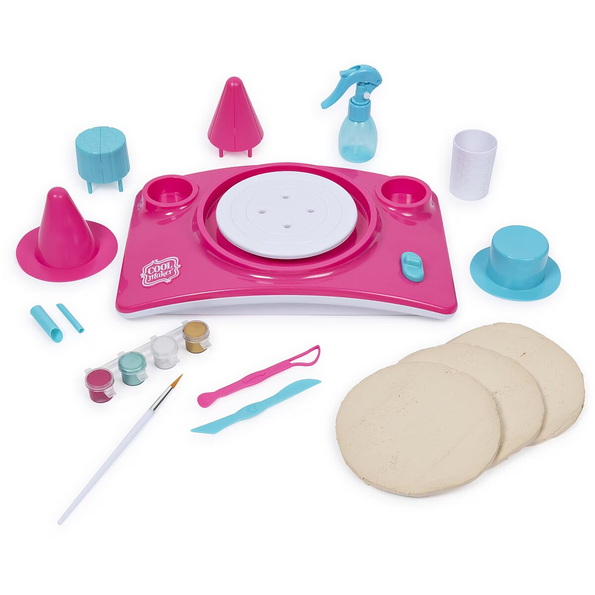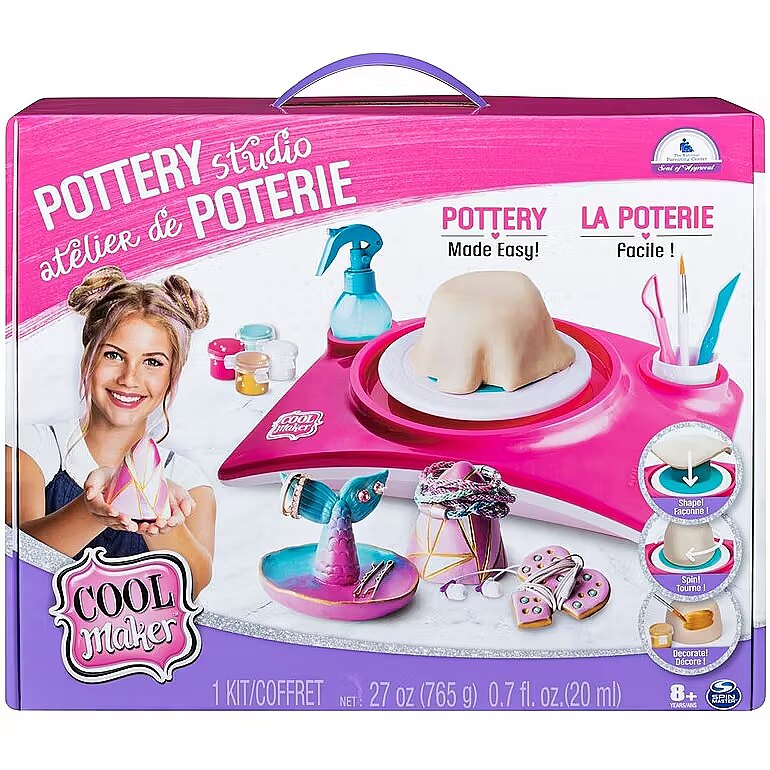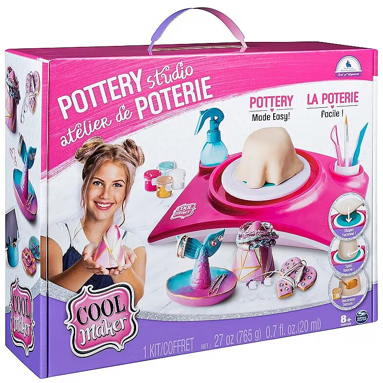 LongDesc - Sculpt endless possibilities with the Cool Maker Pottery Studio! This innovative pottery wheel activity kit makes crafting and designing clay projects incredibly easy and fun to do. With the Pottery Studio, you can create with air-dry clay upside down – the unique design of the studio lets gravity do the work for you. Simply place a clay disk onto one of the core molds, gently spray with water and let your pottery spin and take shape in your hands. Its pottery made easy! Carve details with the sculpting tools and let your clay creations air-dry before painting. With four trendy metallic paint colors, you can customize each creation for a one-of-a-kind look. The Cool Maker Pottery Studio comes with everything you need to start creating right away. Make up to six beautiful projects like a mermaid jewelry dish, bracelet holder and more! Shape, spin and decorate with the Cool Maker Pottery Studio!Includes: 1 Cool Maker Pottery Studio, 1 Spray Bottle, 1 Tool Holder, 3 Clay Disks, 1 Paint Brush, 1 Blue Tool, 1 Pink Tool, 2 Hole Punch Tools, 2 Cores, 2 Sleeves, 4 Colors of Paint (4 x 5ml), 1 Playbook