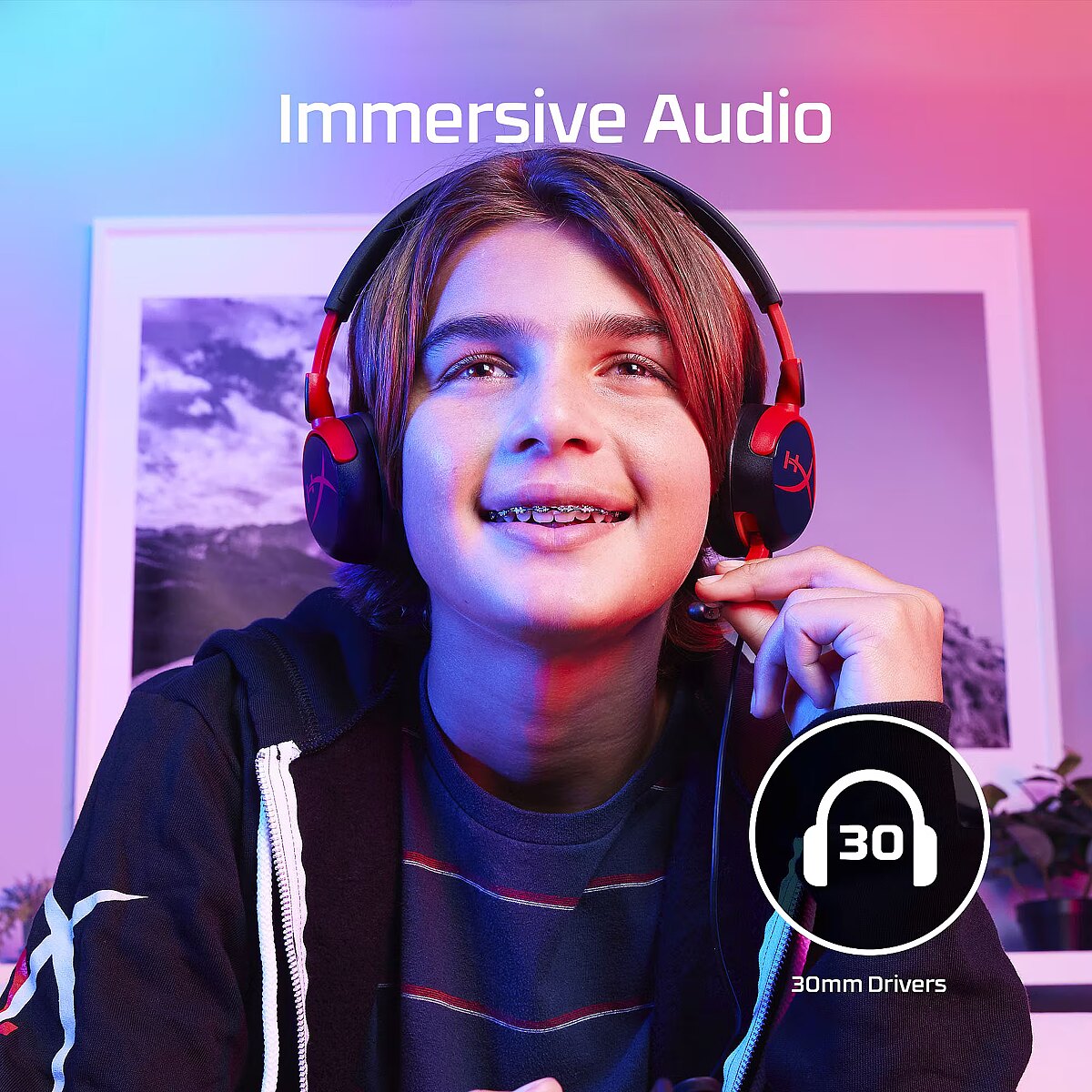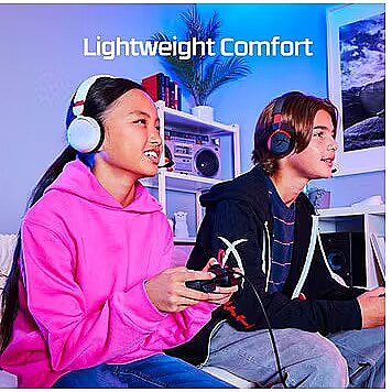 LongDesc - Designed for growing gamers.The HyperX Cloud Mini is a comfortable wired headset built for aspiring star gamers. Recommended for ages 8-12, it’s lightweight and appropriately sized for younger gamers, and more importantly, it’s designed to keep audio levels below 85dB[1]. It features a clear, flip-to-mute mic so younger gamers can chat with their friends online, and it can be tucked away when not in use[3]. The earcups can be rotated when it’s time to take a break, and they’re also great for easy transport or storage. Cloud Mini can easily connect to any device that has a 3.5mm connection, so whether your young gamer is playing on mobile, Chromebook, Nintendo Switch, PlayStation, PC, Steam Deck, or elsewhere, this versatile headset will be ready for it[2].