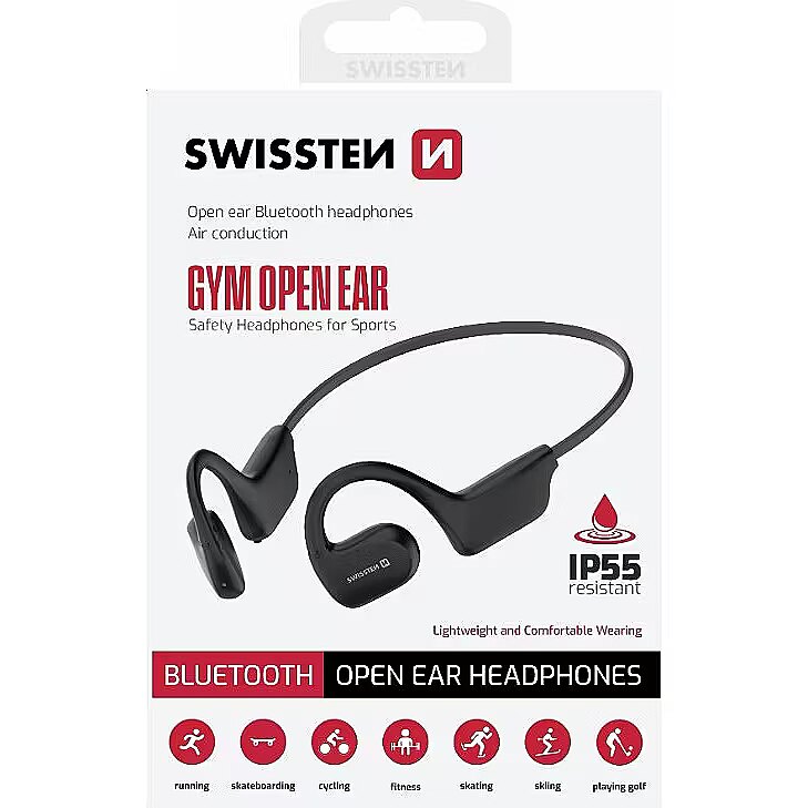 description_lv - Swissten Gym Open Ear bezvadu austiņas ir ideāla izvēle ikvienam, kurš vēlas apvienot kvalitatīvu skaņu ar drošību sporta aktivitāšu laikā. Pateicoties atvērtajam dizainam, jūsu ausis paliek brīvas, ļaujot klausīties mūziku, bet tajā pašā laikā apzināties savu apkārtni. Dolby Atmos 360° telpiskā skaņa SWISSTEN Gym Open Ear austiņas ir aprīkotas ar jaunāko Dolby Atmos 360° tehnoloģiju, nodrošinot bagātīgu un ieskaujošu skaņu. Neatkarīgi no tā, vai skrienat, trenējaties vai vienkārši pavadāt laiku ārā, šīs austiņas nodrošinās ērtu klausīšanos visas aktivitātes laikā. Ūdens un putekļu izturība Pateicoties IP55 aizsardzībai, jums nav jāuztraucas par sviedriem vai lietu, un to vieglais dizains (tikai 24 g) nodrošina, ka valkāšanas laikā tos pat nejutīsit. Jūs varat tos ērti valkāt stundām ilgi, nezaudējot komfortu. Bluetooth savienojums Izmantojot Bluetooth 5.2, jūs iegūstat stabilu savienojumu līdz pat 10 metriem un izbaudiet zvanus un mūziku bez traucējumiem. Akumulators darbojas līdz pat 10 stundām, tāpēc varat baudīt ilgus treniņus vai pastaigas bez nepieciešamības uzlādēt. Atvērto austiņu priekšrocības: Vienkārša vadība ar daudzfunkciju pogu. Integrēts mikrofons brīvroku zvanīšanai. Savietojams ar plašu ierīču un mūzikas programmu klāstu. Augstas kvalitātes skaņa ar dziļiem basiem un līdzsvarotiem diskantiem. Specifikācijas: Ieeja: USB-C 5.0V DC 1.0A / maks. 5W Baterijas veids: litija polimērs (3,7 V) Akumulatora ietilpība: 180 mAh Uzlādes laiks: 2 stundas Akumulatora darbības laiks: 10 stundas (80% skaļuma) Atbalstītie kodeki: SBC Bluetooth versija: 5.2 Bluetooth diapazons: 10 metri Bluetooth profili: A2DP, AVRCP, HFP, HID, AVCTP, AVDTP, SPP Pretestība: 16 omi Jutība: 85 dB Frekvenču diapazons: 20Hz – 20kHz Mikrofona jutība: -42 dB Ūdensizturība: IP55 Tehnoloģija: 360° Dolby Atmos Darba temperatūra: -20°C līdz 40°C Uzglabāšanas temperatūra: -5°C līdz 40°C Izmēri: 125 x 100 x 40 mm Svars: 24g Iekļauts kabelis: USB-A līdz USB-C, 2A, 0,5m