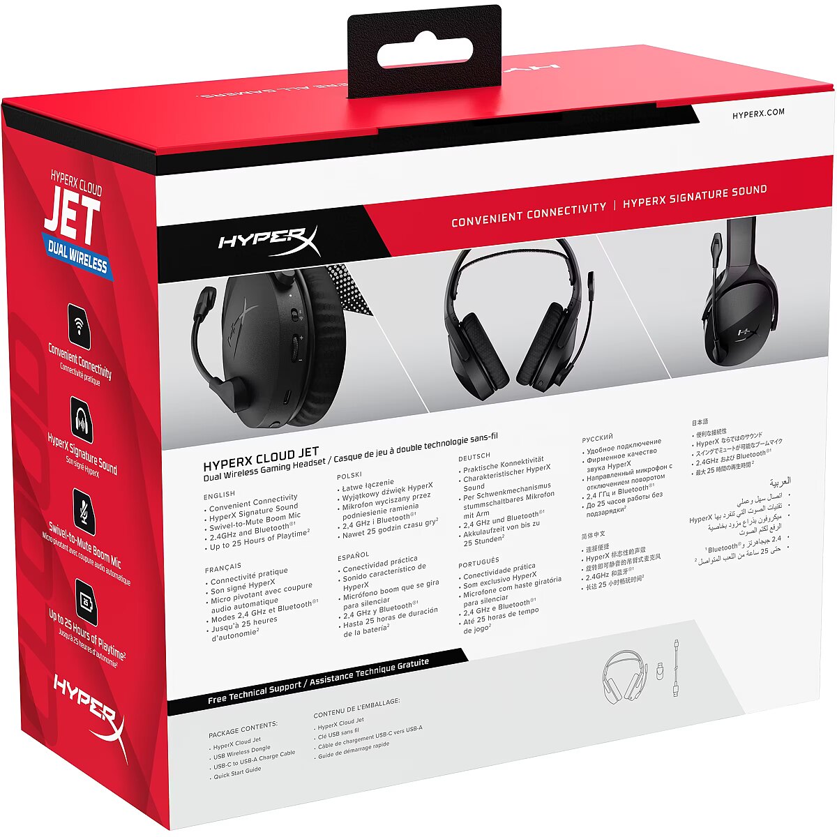 LongSummaryDescription - Cloud Jet - Wireless Gaming Headset (Black). Product type: Headset. Connectivity technology: Wireless, Bluetooth. Recommended usage: Gaming. Headphone frequency: 20 - 20000 Hz. Wireless range: 15 m. Cable length: 1.5 m. Weight: 298 g. Product colour: Black