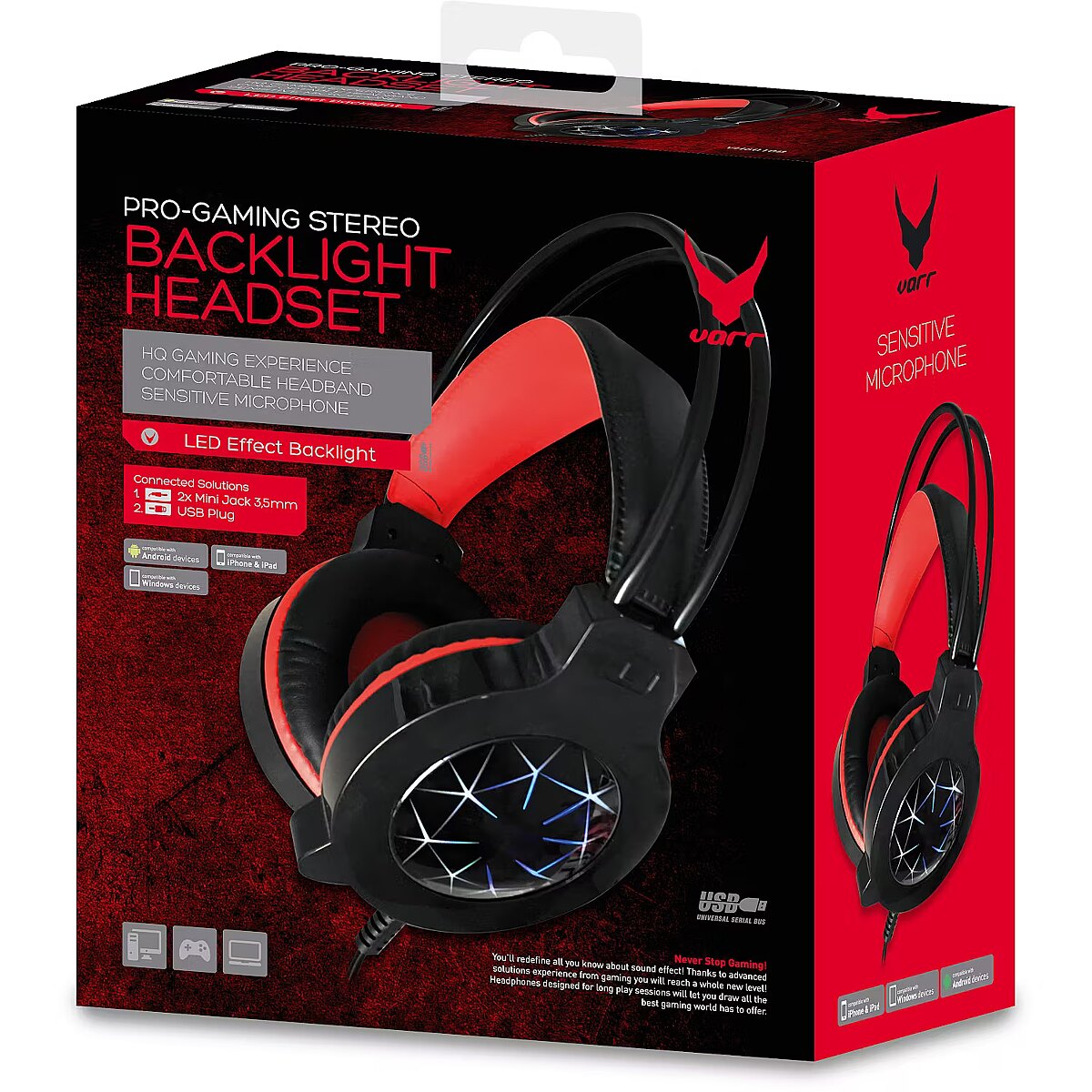 LongDesc - Rugged headphones for avid gamersA reliable headset for demanding players by Varr, made of the highest quality materials. Comfortable ear muffs and light, ergonomic design ensure comfort during long games.COMMUNICATION AT THE HIGHEST LEVELA sensitive microphone enables communication at the highest level. Voice control is facilitated by a discreet knob built into the headphones.UNFORGETTABLE AUDIOVISUAL IMPRESSIONSIn addition to red accents on the black housing, the visual impression is provided by LED backlight. The round shape of the shell makes it even more comfortable to use.