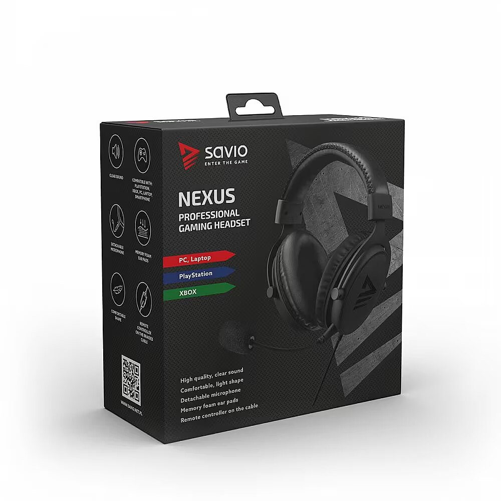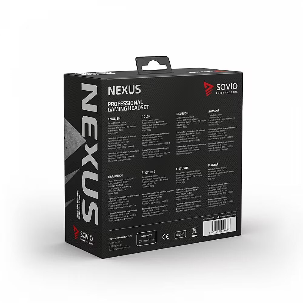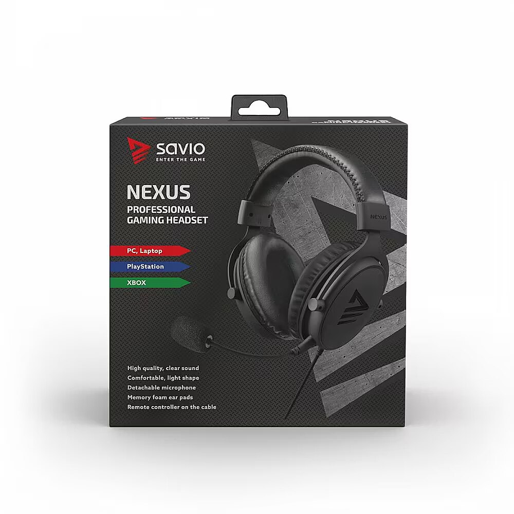 Description - SAVIO NEXUS gaming headphones with microphone Specification: Headphone type: Stereo Type of headphones: Closed Interface: Jack 3,5mm + adapter PC Cable lenght: 2,2m Weight: 360g Membrane diameter: 50mm Impedance: 32Ohm +/- 15% Sensitivity: 98dB +/- 4dB Frequency response: 20Hz 20000Hz Microphone spec Sensitivity: -54dB +/- 3dB Frequency response:: 50Hz 10000Hz