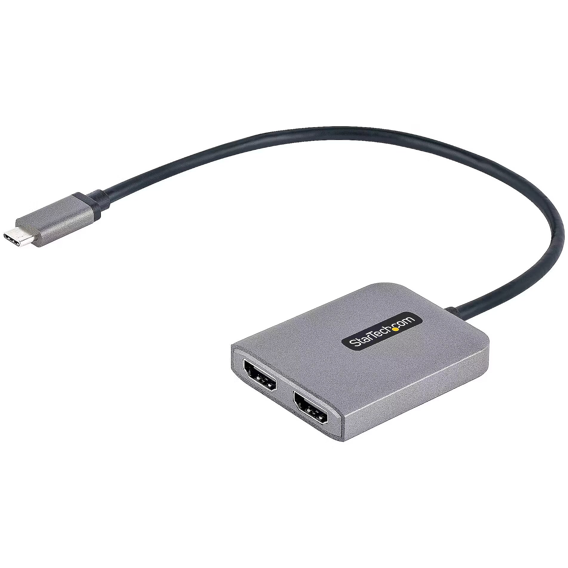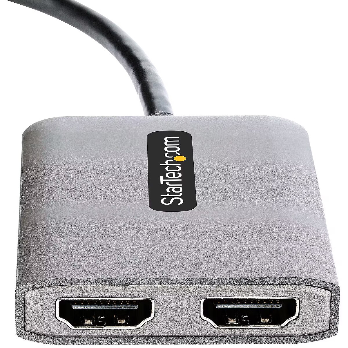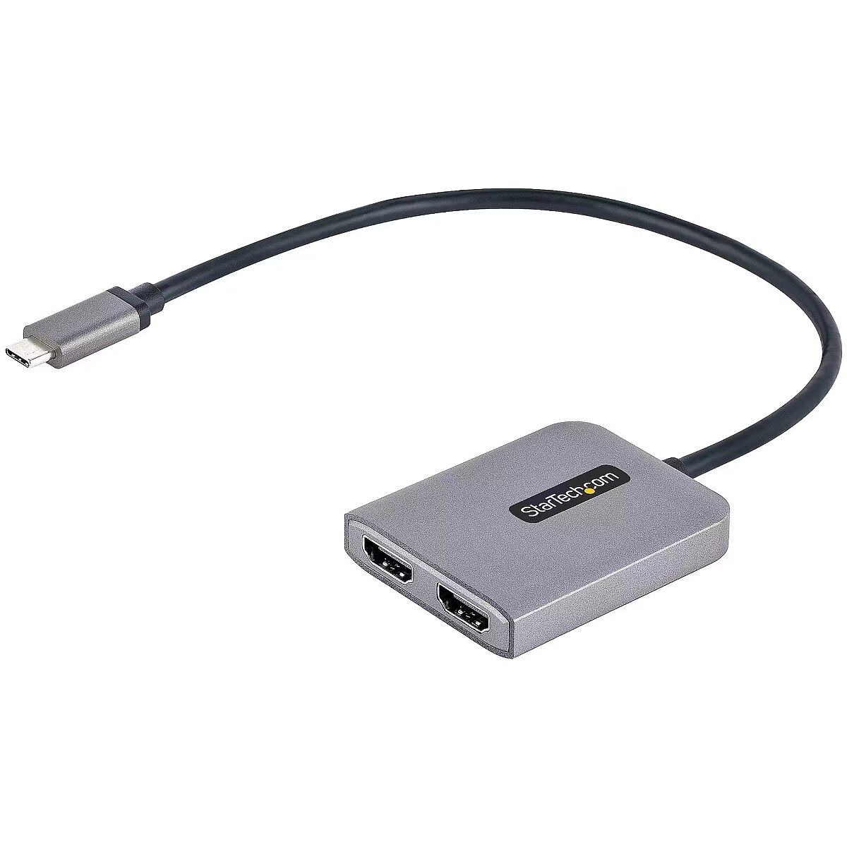 LongDesc - Create a high-performance dual-display workstation by connecting a USB Type-C™ device to two independent HDMI® monitorsThis USB-C to HDMI MST Hub allows you to connect two HDMI monitors, using a USB-C enabled host device.Multi-tasking Made EasyThis USB-C to HDMI video splitter connects up to two additional displays in extended or mirror mode. Connecting two independent 4K 60Hz displays creates high-performance workstations, for users in your organization enabling easier multi-tasking resulting in increased productivity.Host ConnectionOutput 1 ResolutionOutput 2 ResolutionDisplayPort 1.4 with DSC4K 60Hz4K 60HzDisplayPort 1.44K 60Hz4K 30HzDisplayPort 1.24K 30Hz4K 30Hz4K at 60Hz and HDRMulti-Stream Transport (MST) technology combines multiple video signals into a single signal/stream. This MST Hub separates the single stream into two independent signals, one for each HDMI enabled display. Support for High Dynamic Range (HDR) offers increased contrast, brightness, colors, and greater luminosity.Hassle-Free SetupWindows devices that support DP Alt Mode over USB-C feature native support for MST. This USB-C to HDMI hub is compatible with Thunderbolt 4, Thunderbolt 3, and USB4 enabled Windows devices. Plug-and-play installation with no drivers or software required. The 12in (30cm) attached cable provides options for flexible installation configurations, reducing the amount of strain on ports and connectors. Additionally, this dual-monitor splitter is bus-powered, meaning no external power is required.MST14CD122HD is backed by a StarTech.com 3-year warranty, and free lifetime multilingual, North American based technical support.The StarTech.com Advantage