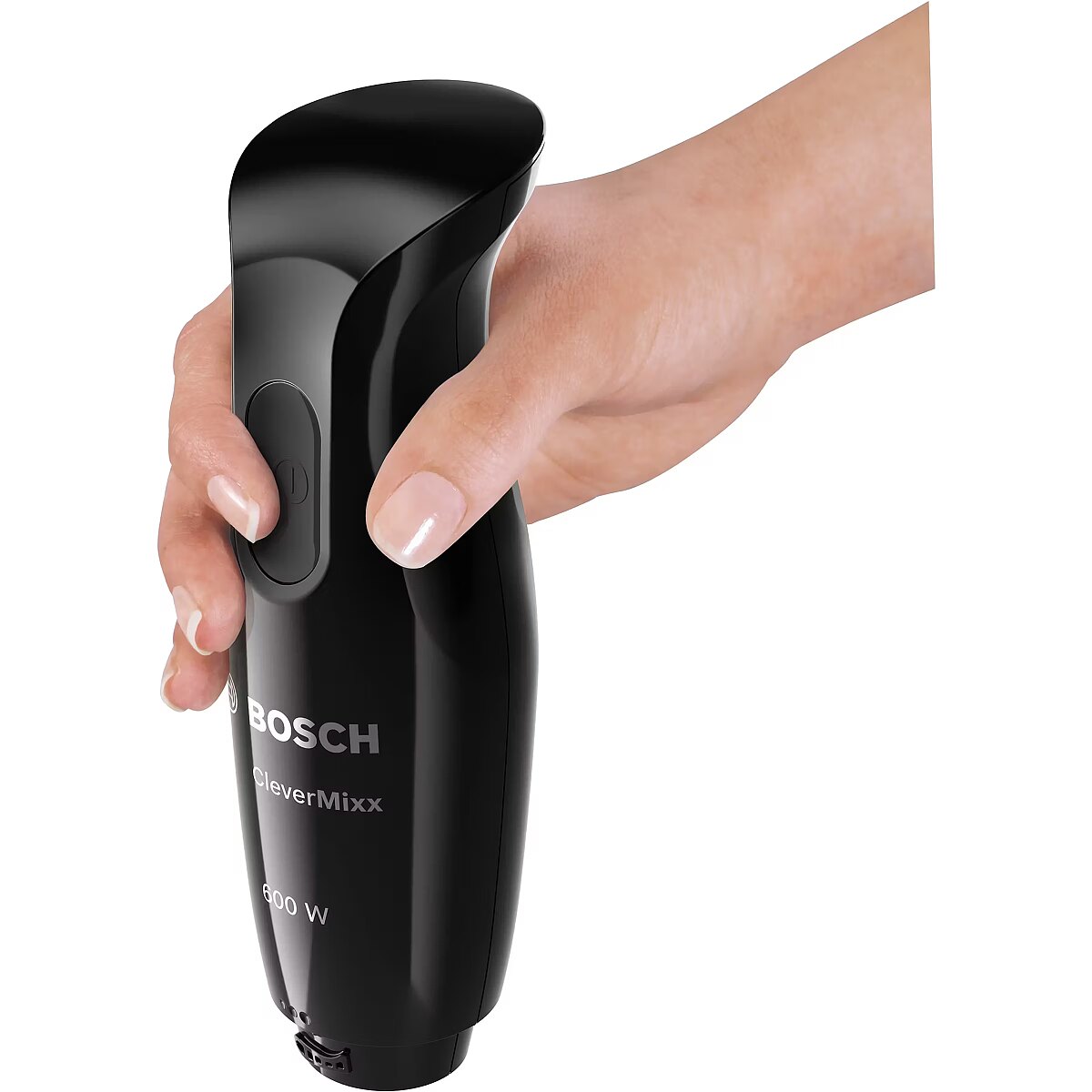 LongDesc - The Bosch CleverMixx: The all-round talent for more fun in the kitchen - with additional SlimFoot- Effortless pureeing and mixing, without annoying splashes thanks to the newly designed stainless steel mixer foot.- Ingredients are perfectly mixed and properly pureed in very short time - with the extra-powerful 600 W motor.- With its ergonomic handle, the CleverMixx fits perfectly in your hand, and its low weight also makes it simple and comfortable to use.- Measuring jug included - Measure the required quantity of ingredients easily and mix them in the beaker.The rust free stainless steel mixer foot and other accessories are dishwasher-safe600 watts — power and convenience.Powerful with low noise and low vibrations. The 600-watt motor makes short work of anything you want to mix and crush — and it's incredibly convenient.