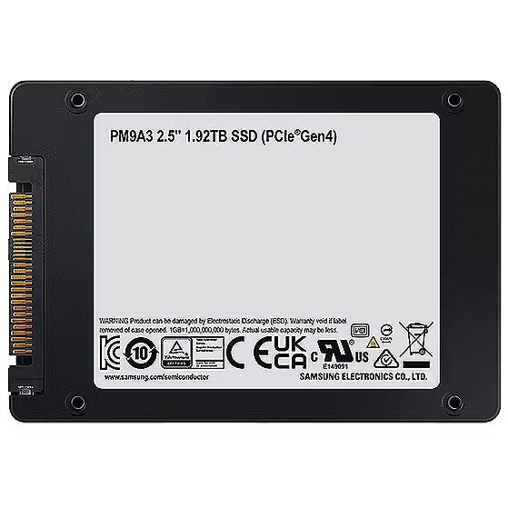 LongDesc - High performance, highly reliable and secure NVMe U.2 SSD designed for servers that need enhanced data reliability to safeguard critical dataEnhanced for speed and reliabilityThe PM9A3 is the solution to achieving high responsiveness in data centers requiring accelerated performance. Available in capacities of 960GB, 1.92TB, 3.84TB and 7.68TB, the PM9A3 enables your business to excel in handling big data.Seamless, high-powered performanceGet fast results with the next-gen NVMe interface. Sequential read/write speeds of up to 6,900/4,100 MB/s, random read/write speeds of up to 1100K/200K IOPS and a suberb level of QoS (quality of service) allow for real-time big data analytics.Secure critical dataData integrity is critical to data center SSD. The PM9A3 NVMe U.2 is safeguarded with end-to-end data protection to ensure consistency over the entire data transfer path and prevents data corruption in case of power failure with power loss protection.Enhanced operations efficiencyAccomplish far more with less. Achieve higher efficiency and performance compared to legacy storage systems, with fewer servers, reduced power and cooling, and lower TCO, all with efficient management from the advanced Samsung SSD Toolkit software. Samsung reliability and qualityExperience the superior SSD quality and reliability of in-house production using Samsung built components. Empower your 24/7 business to run faster, more efficiently, and at reduced costs with world-class dependability with a limited 5-year warranty or 1.0 DWPD.
