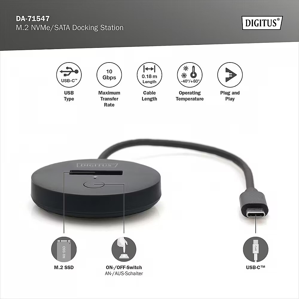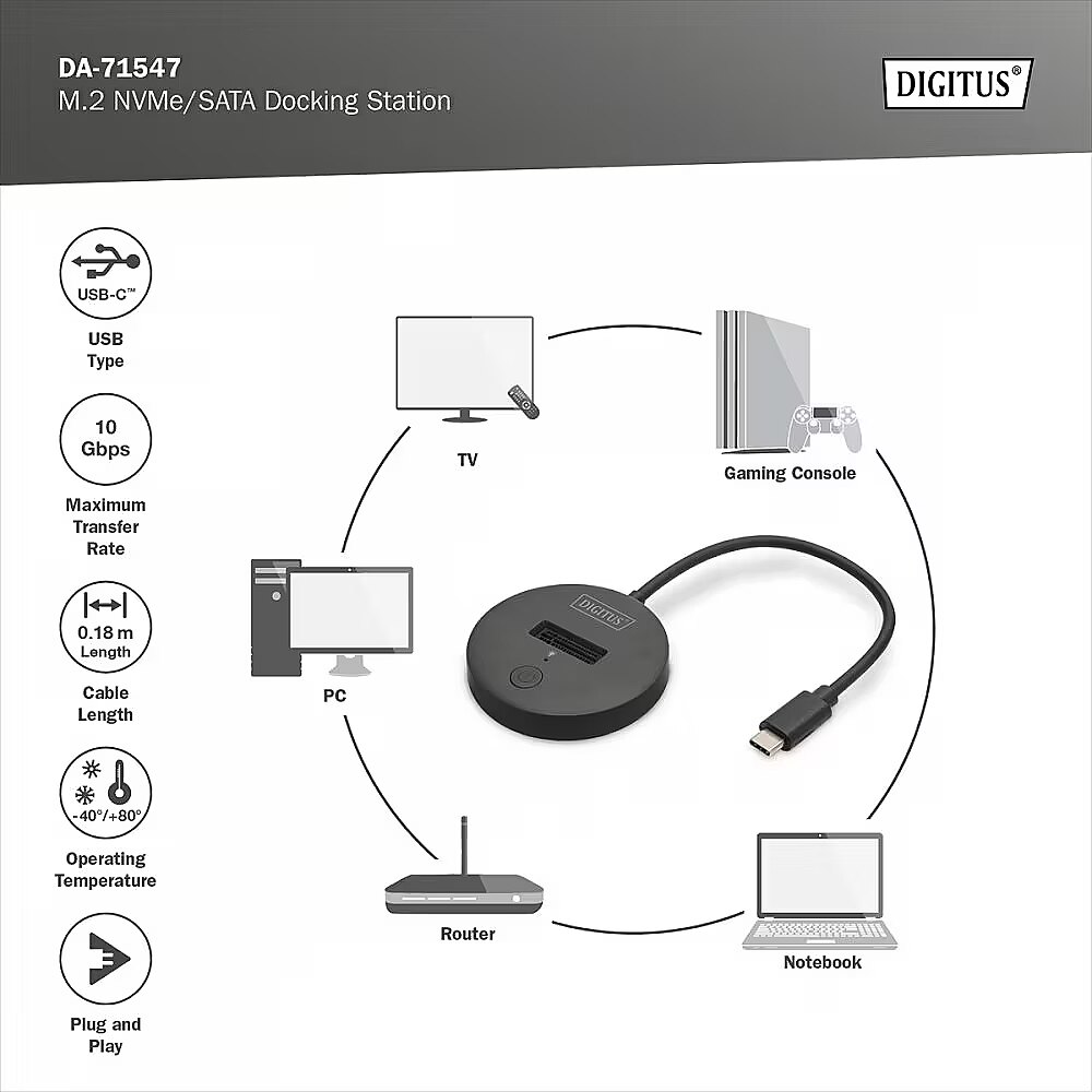 Description - Manage M.2 NVMe and M.2 SATA SSDs via USB-C The DIGITUS SSD docking station enables the installation of M.2 SSD drives of the NVMe or SATA standard with a capacity of up to 4 TB. NVMe SSDs with B+M Key & M-Key and SATA SSDs with B+M-Key are supported, each in 2242, 2260, 2280 & 22110 formats. Easily expand the storage capacity of numerous USB-C devices, such as computers, notebooks, TV equipment, consoles and routers. SATA M.2 support. NVMe SSD with B+M key and NVMe SSD with M key Supported formats: 2242, 2260, 2280 and 22110 Supports NVMe SSDs and SATA SSDs with a capacity of up to 4 TB High data transmission speed - up to 10 Gbps (U.A.S.P + T.R.I.M support) Data storage formats: NTFS, FAT, FAT32 USB-C connector: USB 3.2 Gen2 Systems: Windows 11/10/8/8.1/7/XP, macOS 10.0 or later Perfect memory expansion for notebooks, PCs, consoles, TV equipment, NAS and routers (USB-C) Plug and Play - no drivers required